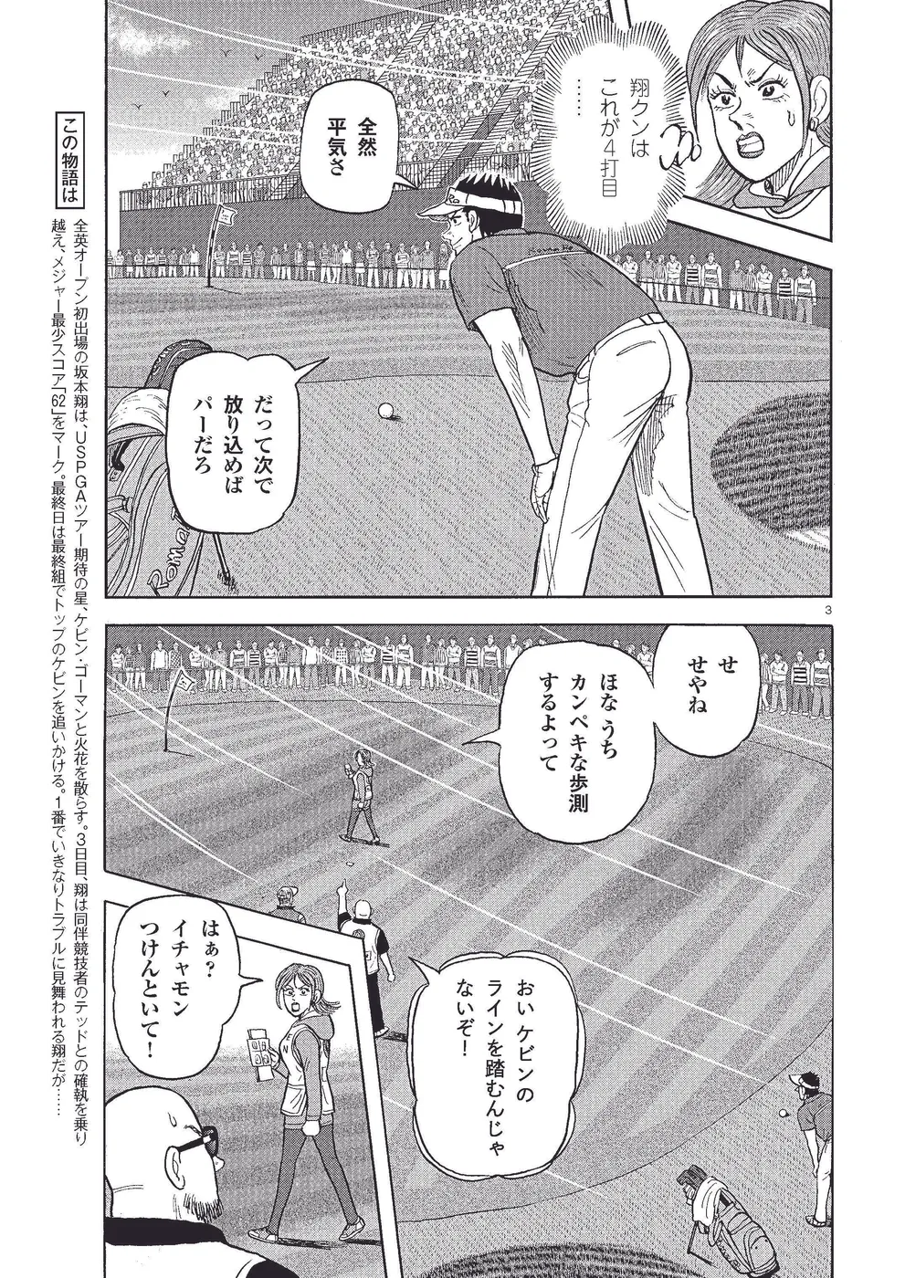 全英オープン初出場の坂本翔は、USPGAツアー期待の星、ケビン・ゴーマンと火花を散らす。3日目、翔は同伴競技者のテッドとの確執を乗り越え、メジャー最少スコア「62」をマーク。最終日は最終組でトップのケビンを追いかける。1番でいきなりトラブルに見舞われる翔だが……