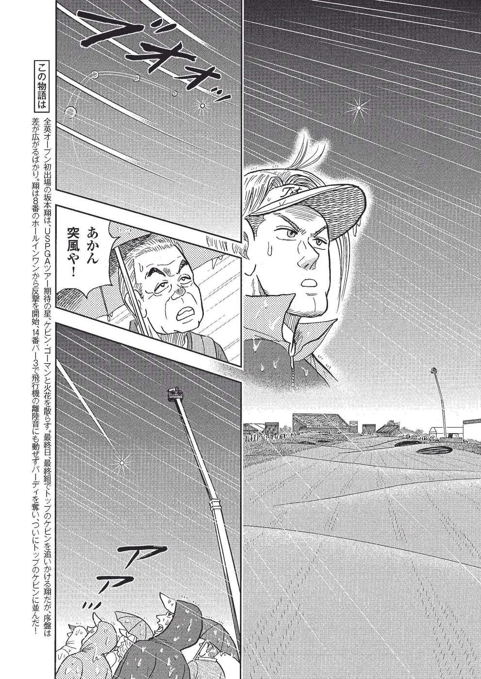 全英オープン初出場の坂本翔は、USPGAツアー期待の星、ケビン・ゴーマンと火花を散らす。最終日、最終組でトップのケビンを追いかける翔だが、序盤は差が広がるばかり。翔は8番のホールインワンから反撃を開始、14番パー3で飛行機の離陸音にも動ぜずバーディを奪い、ついにトップのケビンに並んだ!