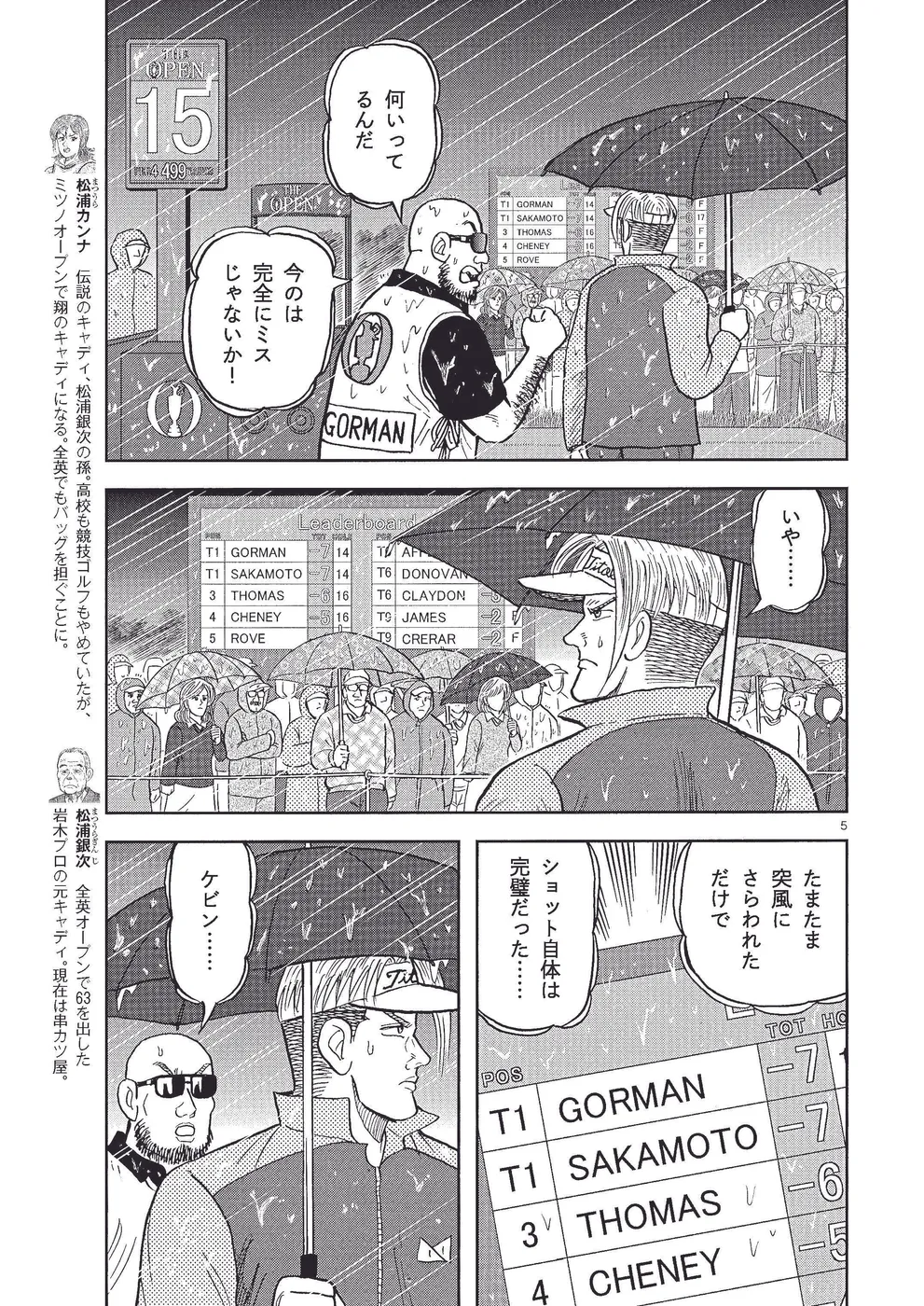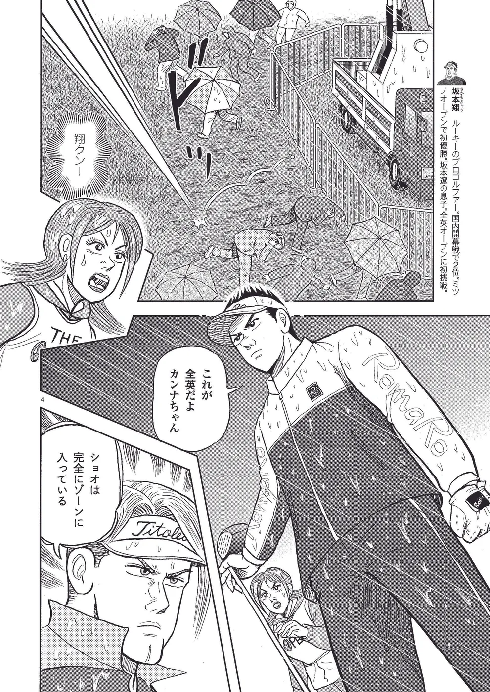 全英オープン初出場の坂本翔は、USPGAツアー期待の星、ケビン・ゴーマンと火花を散らす。最終日、最終組でトップのケビンを追いかける翔だが、序盤は差が広がるばかり。翔は8番のホールインワンから反撃を開始、14番パー3で飛行機の離陸音にも動ぜずバーディを奪い、ついにトップのケビンに並んだ!