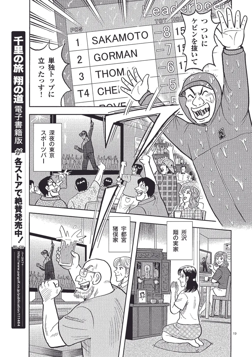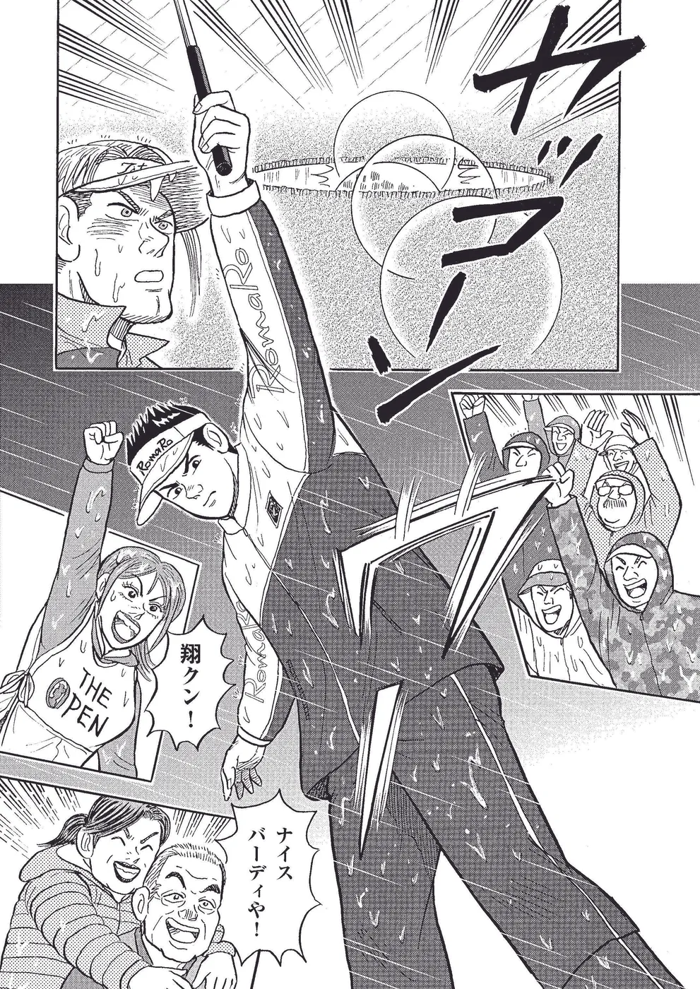 全英オープン初出場の坂本翔は、USPGAツアー期待の星、ケビン・ゴーマンと火花を散らす。最終日、最終組でトップのケビンを追いかける翔だが、序盤は差が広がるばかり。翔は8番のホールインワンから反撃を開始、14番パー3で飛行機の離陸音にも動ぜずバーディを奪い、ついにトップのケビンに並んだ!