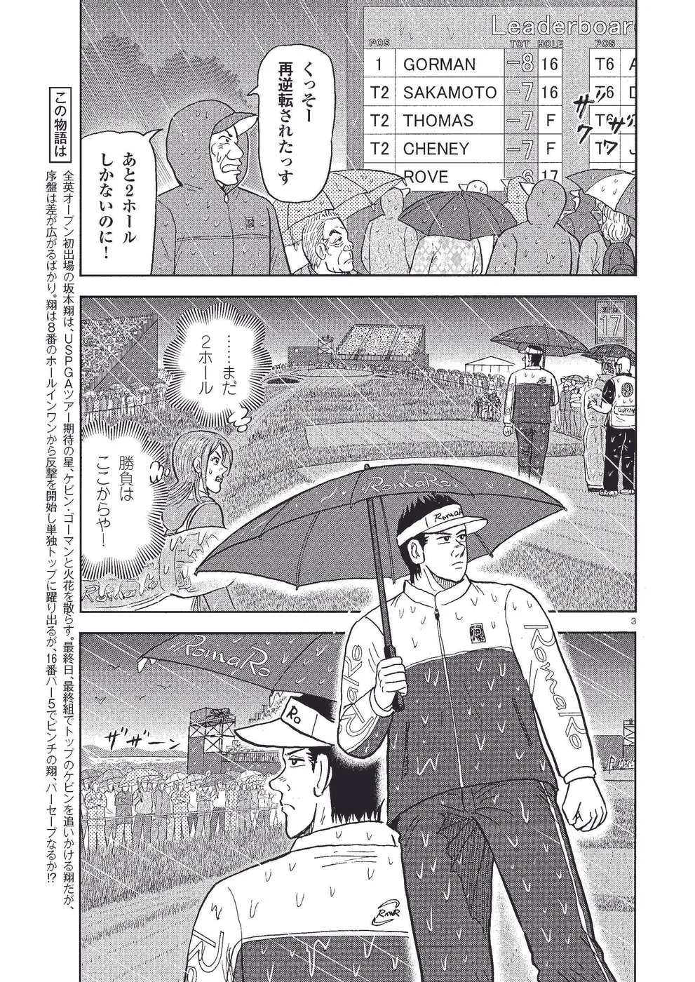 全英オープン初出場の坂本翔は、USPGAツアー期待の星、ケビン・ゴーマンと火花を散らす。最終日、最終組でトップのケビンを追いかける翔だが、序盤は差が広がるばかり。翔は8番のホールインワンから反撃を開始し単独トップに躍り出るが、16番パー5でピンチの翔、パーセーブなるか!?