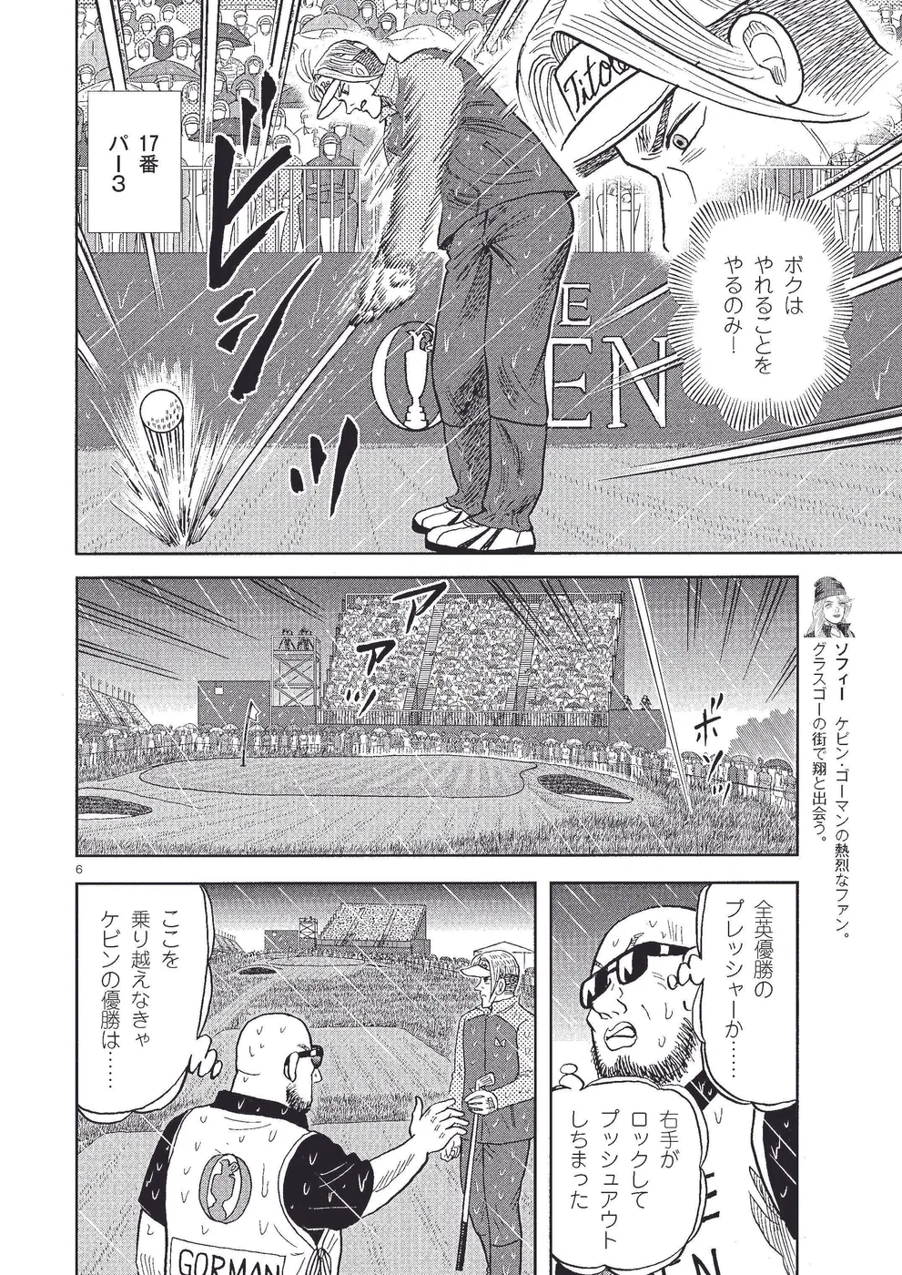 全英オープン初出場の坂本翔は、USPGAツアー期待の星、ケビン・ゴーマンと火花を散らす。最終日、最終組でトップのケビンを追いかける翔だが、序盤は差が広がるばかり。翔は8番のホールインワンから反撃を開始し単独トップに躍り出るが、16番パー5でピンチの翔、パーセーブなるか!?