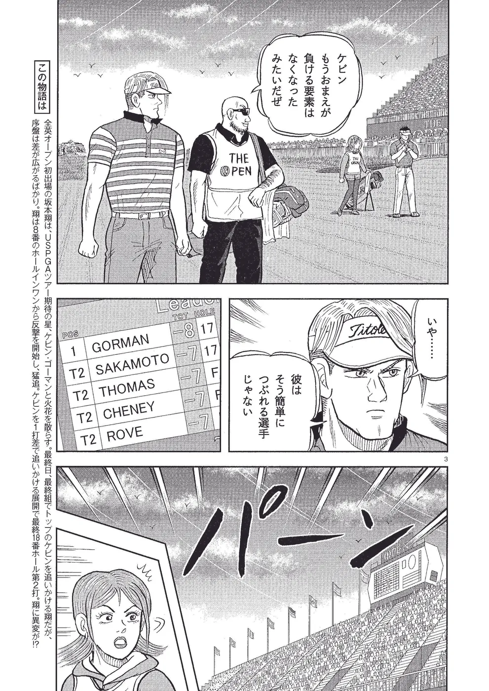 全英オープン初出場の坂本翔は、USPGAツアー期待の星、ケビン・ゴーマンと火花を散らす。。最終日、最終組でトップのケビンを追いかける翔だが、序盤は差が広がるばかり。翔は8番のホールインワンから反撃を開始し、猛追。ケビンを1打差で追いかける展開で最終18番ホール第2打。翔に異変が!?
