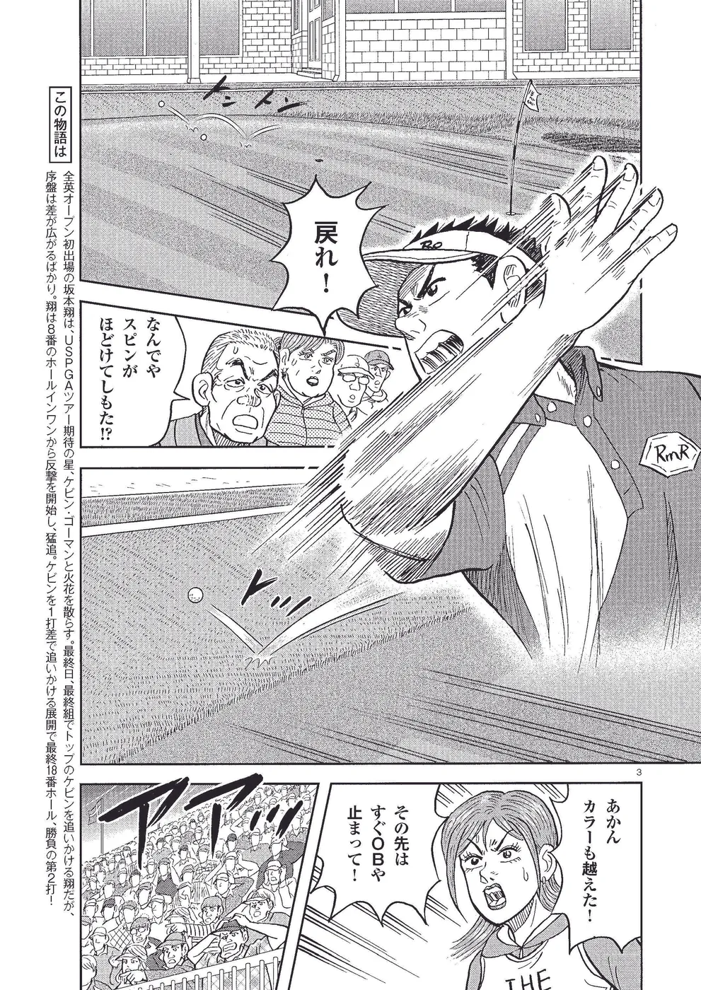 全英オープン初出場の坂本翔は、USPGAツアー期待の星、ケビン・ゴーマンと火花を散らす。最終日、最終組でトップのケビンを追いかける翔だが、序盤は差が広がるばかり。翔は8番のホールインワンから反撃を開始し、猛追。ケビンを1打差で追いかける展開で最終18番ホール、勝負の第2打!