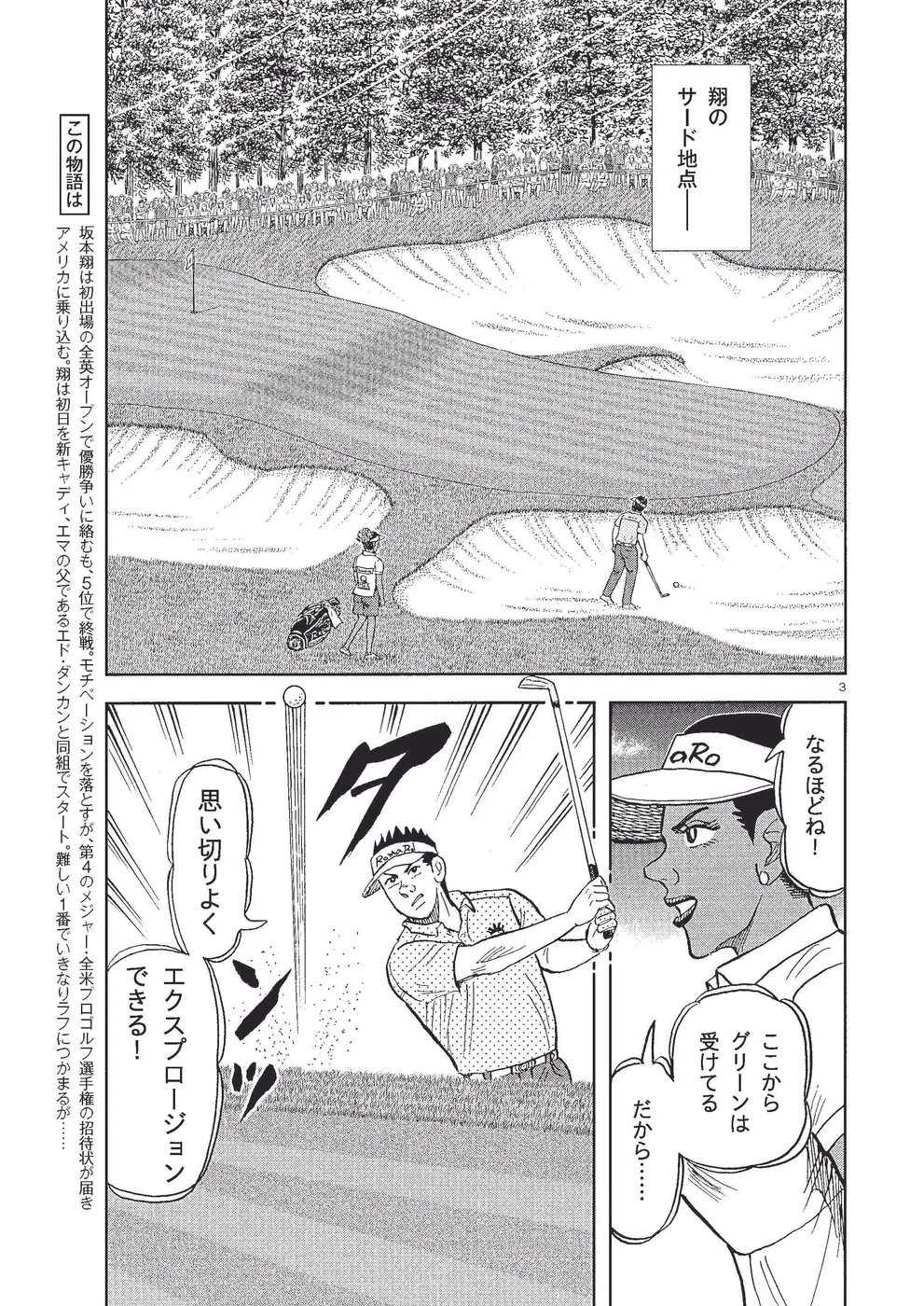 坂本翔は初出場の全英オープンで優勝争いに絡むも、5位で終戦。モチベーションを落とすが、第4のメジャー・全米プロゴルフ選手権の招待状が届きアメリカに乗り込む。翔は初日を新キャディ、エマの父であるエド・ダンカンと同組でスタート。難しい1番でいきなりラフにつかまるが……