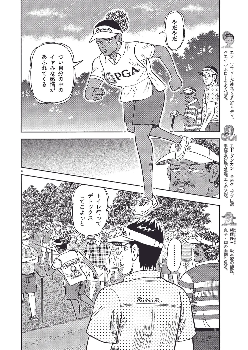 坂本翔は初出場の全英オープンで優勝争いに絡むも、5位で終戦。モチベーションを落とすが、第4のメジャー・全米プロゴルフ選手権の招待状が届き渡米。初日、翔の新キャディ・エマの父であるエド・ダンカンと同組でスタート。難コースを順調にホールを重ねていく翔だが……