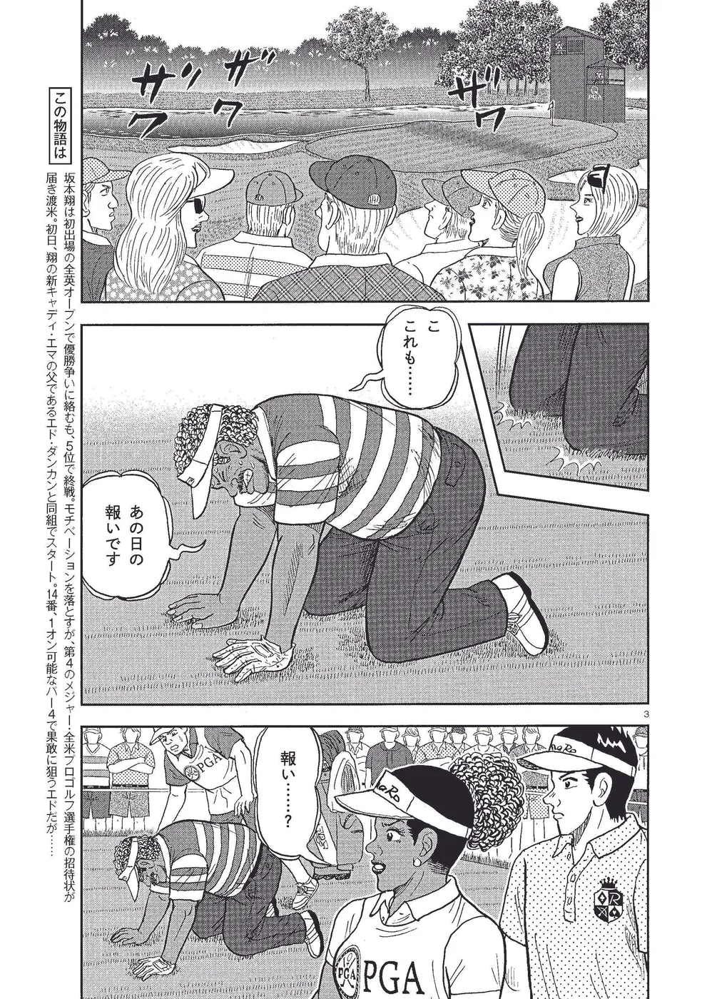 坂本翔は初出場の全英オープンで優勝争いに絡むも、5位で終戦。モチベーションを落とすが、第4のメジャー・全米プロゴルフ選手権の招待状が届き渡米。初日、翔の新キャディ・エマの父であるエド・ダンカンと同組でスタート。14番、1オン可能なパー4で果敢に狙うエドだが……。
