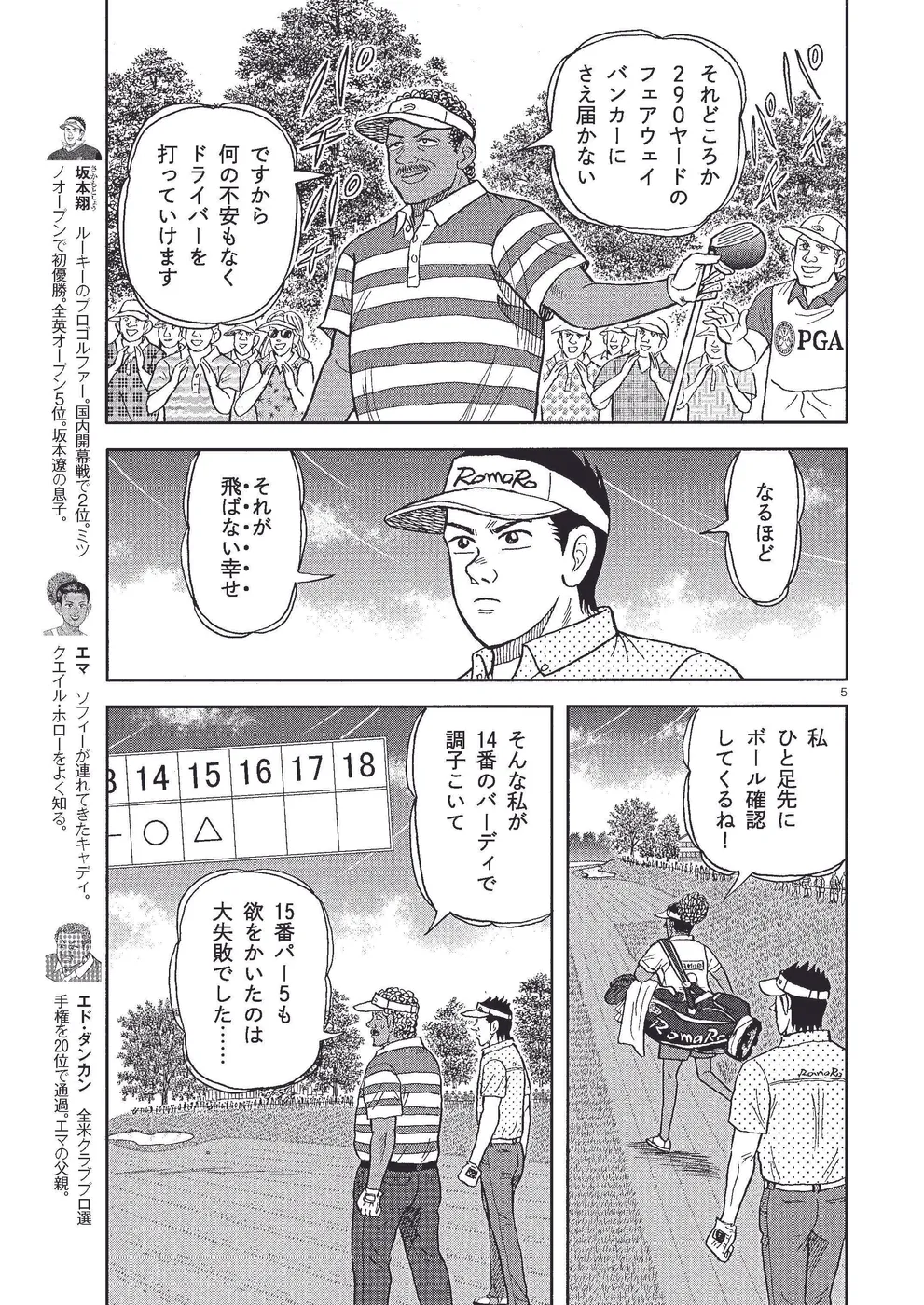 坂本翔は初出場の全英オープンで優勝争いに絡むも、5位で終戦。モチベーションを落とすが、全米プロゴルフ選手権の招待状が届き渡米する。初日、翔の新キャディ・エマの父であるエド・ダンカンと同組でスタート。難しい上がり3ホールの〝グリーンマイル〟にやって来た翔だが……。