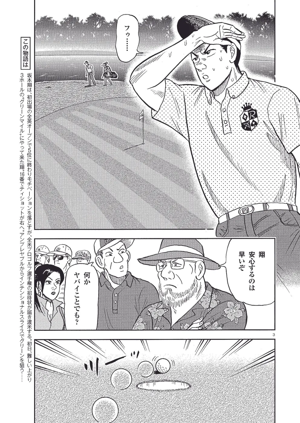 坂本翔は、初出場の全英オープンで5位に終わりモチベーションを落とすが、全米プロゴルフ選手権の招待状が届き渡米する。初日、難しい上がり3ホールの〝グリーンマイル〟にやって来た翔。16番でティショットが右へ。アンプレヤブルからインテンショナルスライスでグリーンを狙う……。