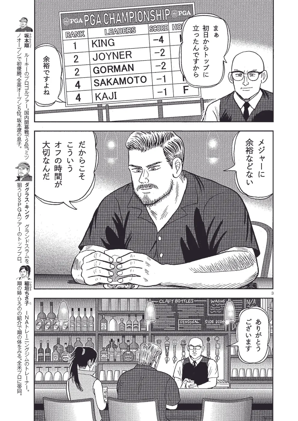 坂本翔は、初出場の全英オープンで5位に終わる。モチベーションを落とすが、全米プロゴルフ選手権の招待状が届き、渡米。初日、難しい上がり3ホールの〝グリーンマイル〟でスコアを落とすも、何とか粘って1アンダーでフィニッシュ。単独トップのキングとは3打差につけた翔だが……