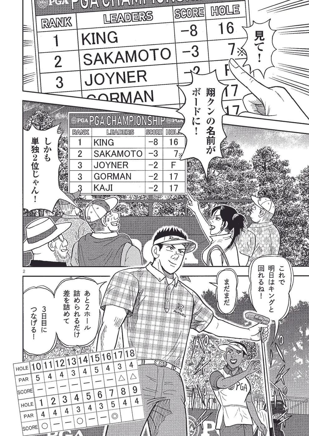 坂本翔は全米プロゴルフ選手権に出場。初日、翔は難しい上がり3ホールの〝グリーンマイル〟でスコアを落とすが、粘って1アンダーで初日を終えた。2日目スタート前に翔は首位のキングに「60台を出せ」といわれる。前半トータル1オーバーから後半1アンダーに戻し、残り3ホールの翔だが……