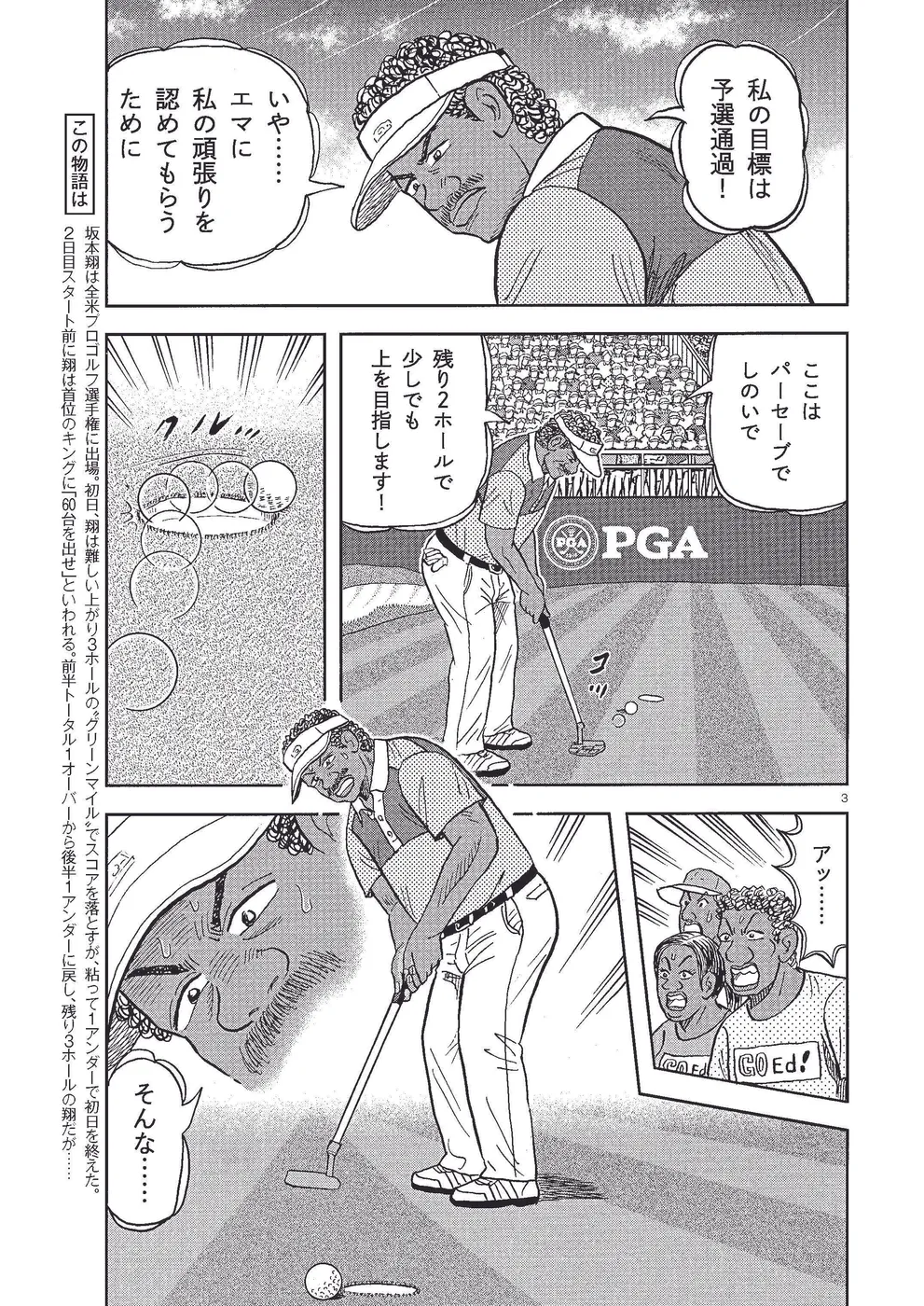 坂本翔は全米プロゴルフ選手権に出場。初日、翔は難しい上がり3ホールの〝グリーンマイル〟でスコアを落とすが、粘って1アンダーで初日を終えた。2日目スタート前に翔は首位のキングに「60台を出せ」といわれる。前半トータル1オーバーから後半1アンダーに戻し、残り3ホールの翔だが……
