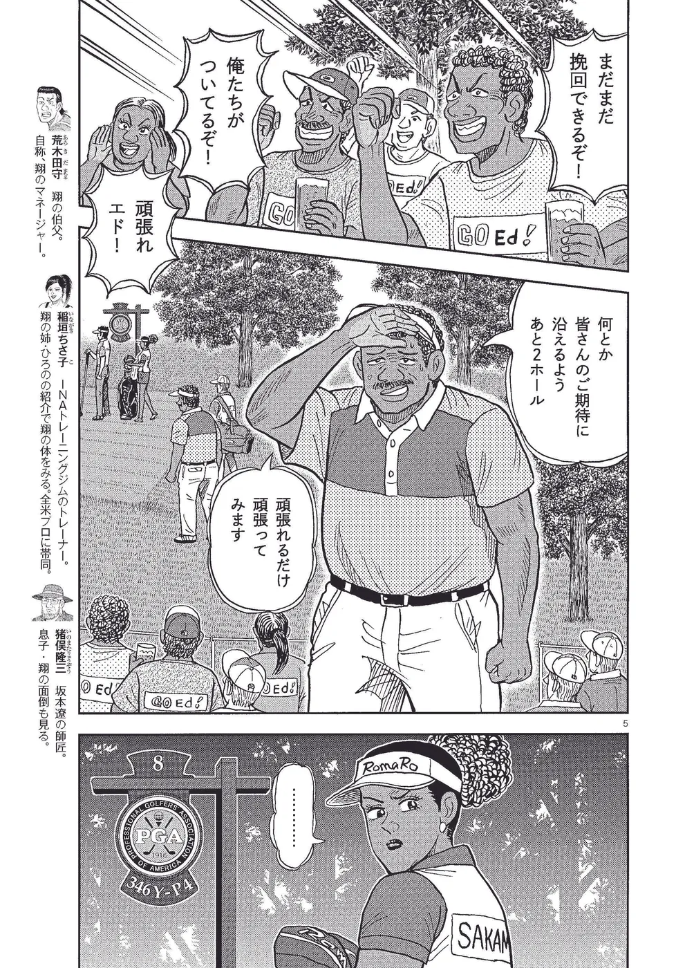 坂本翔は全米プロゴルフ選手権に出場。初日、翔は難しい上がり3ホールの〝グリーンマイル〟でスコアを落とすが、粘って1アンダーで初日を終えた。2日目スタート前に翔は首位のキングに「60台を出せ」といわれる。前半トータル1オーバーから後半1アンダーに戻し、残り3ホールの翔だが……