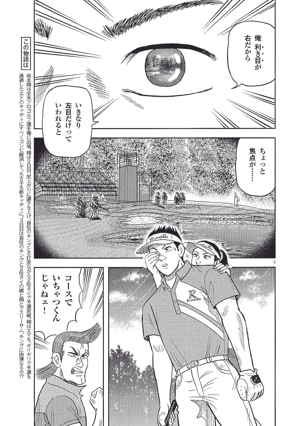 坂本翔は全米プロゴルフ選手権に出場。翔は2日目、尻上がりに調子を上げ、首位のキングと5打差ながら2位タイで予選突破。翔はエマを、ギリギリで予選を通過したエドのキャディにすべくコンビ解消して、ちさ子を新キャディに。3日目は首位のキングと2位タイの梶と翔とでスリーサム。キングに肉薄なるか!?