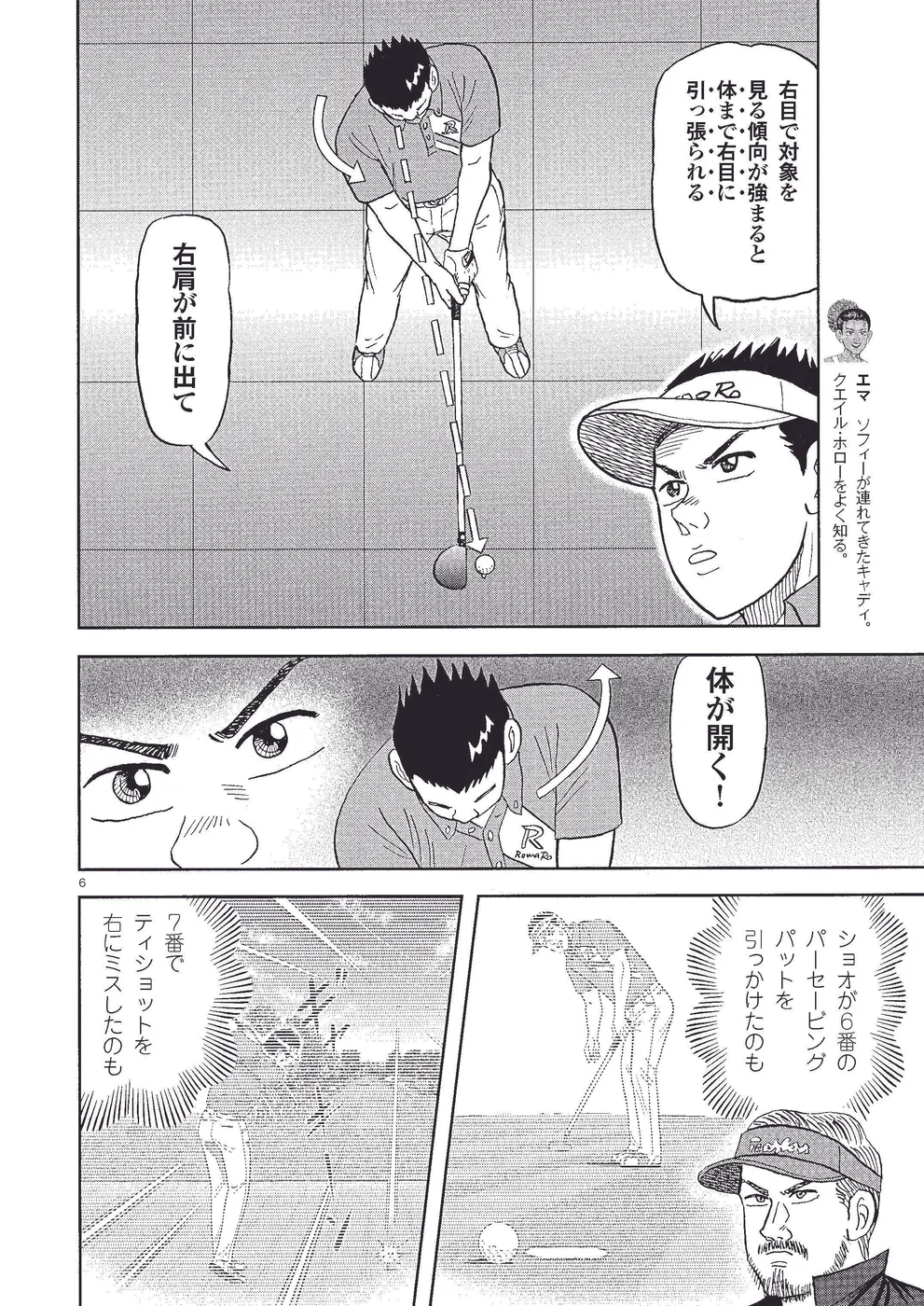 坂本翔は全米プロゴルフ選手権に出場。翔は2日目、尻上がりに調子を上げ、首位のキングと5打差ながら2位タイで予選突破。翔はエマを、ギリギリで予選を通過したエドのキャディにすべくコンビ解消して、ちさ子を新キャディに。3日目は首位のキングと2位タイの梶と翔とでスリーサム。キングに肉薄なるか!?