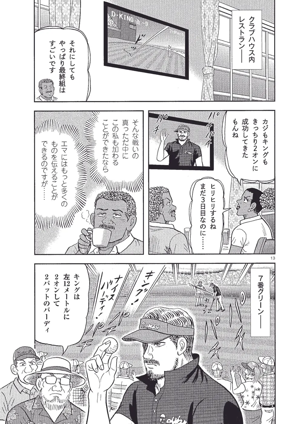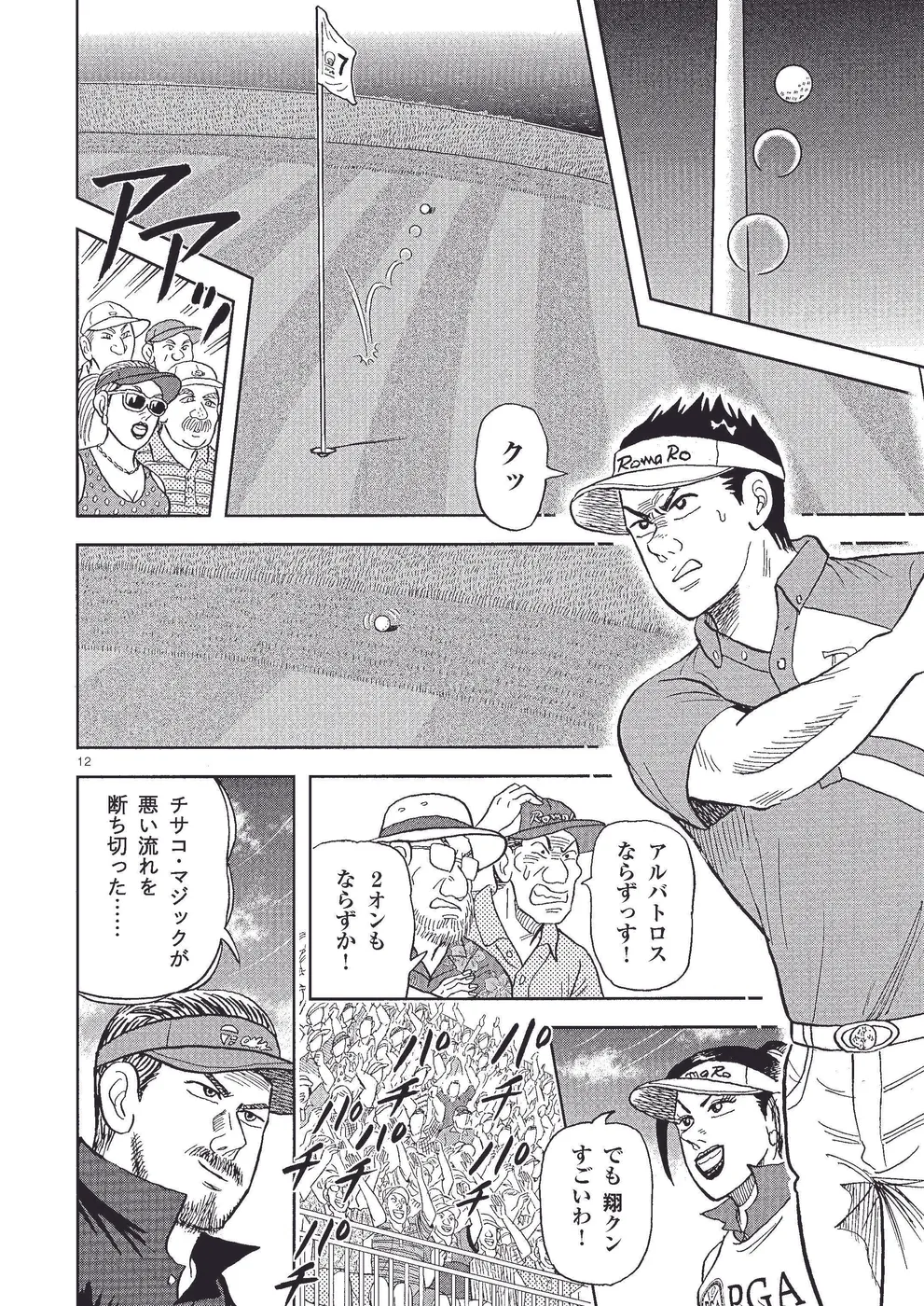 坂本翔は全米プロゴルフ選手権に出場。翔は2日目、尻上がりに調子を上げ、首位のキングと5打差ながら2位タイで予選突破。翔はエマを、ギリギリで予選を通過したエドのキャディにすべくコンビ解消して、ちさ子を新キャディに。3日目は首位のキングと2位タイの梶と翔とでスリーサム。キングに肉薄なるか!?