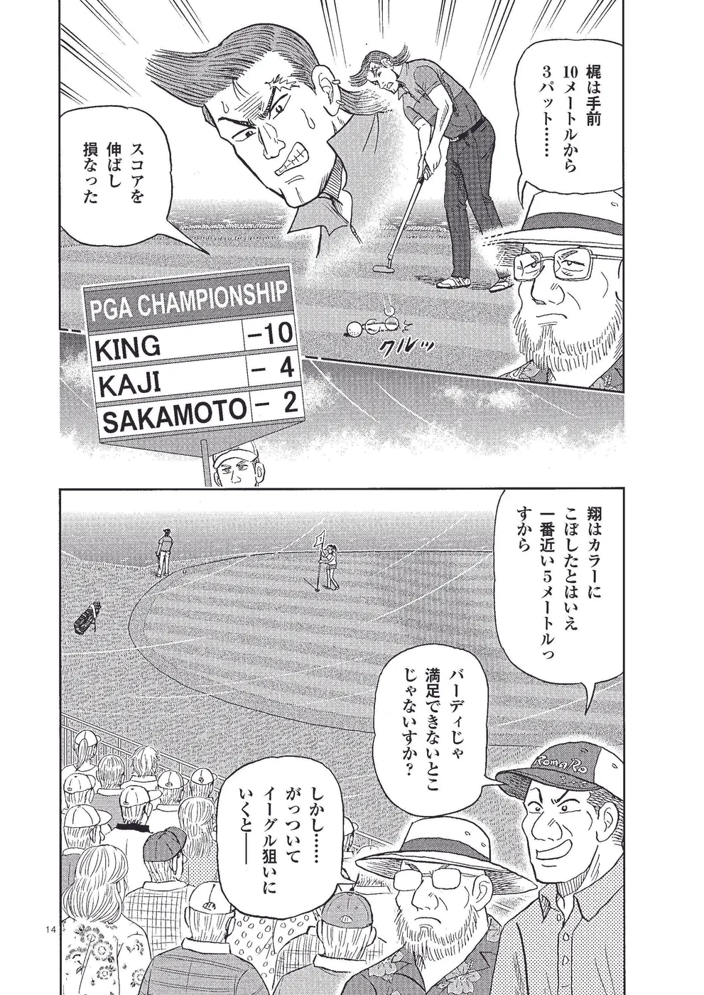 坂本翔は全米プロゴルフ選手権に出場。翔は2日目、尻上がりに調子を上げ、首位のキングと5打差ながら2位タイで予選突破。翔はエマを、ギリギリで予選を通過したエドのキャディにすべくコンビ解消して、ちさ子を新キャディに。3日目は首位のキングと2位タイの梶と翔とでスリーサム。キングに肉薄なるか!?