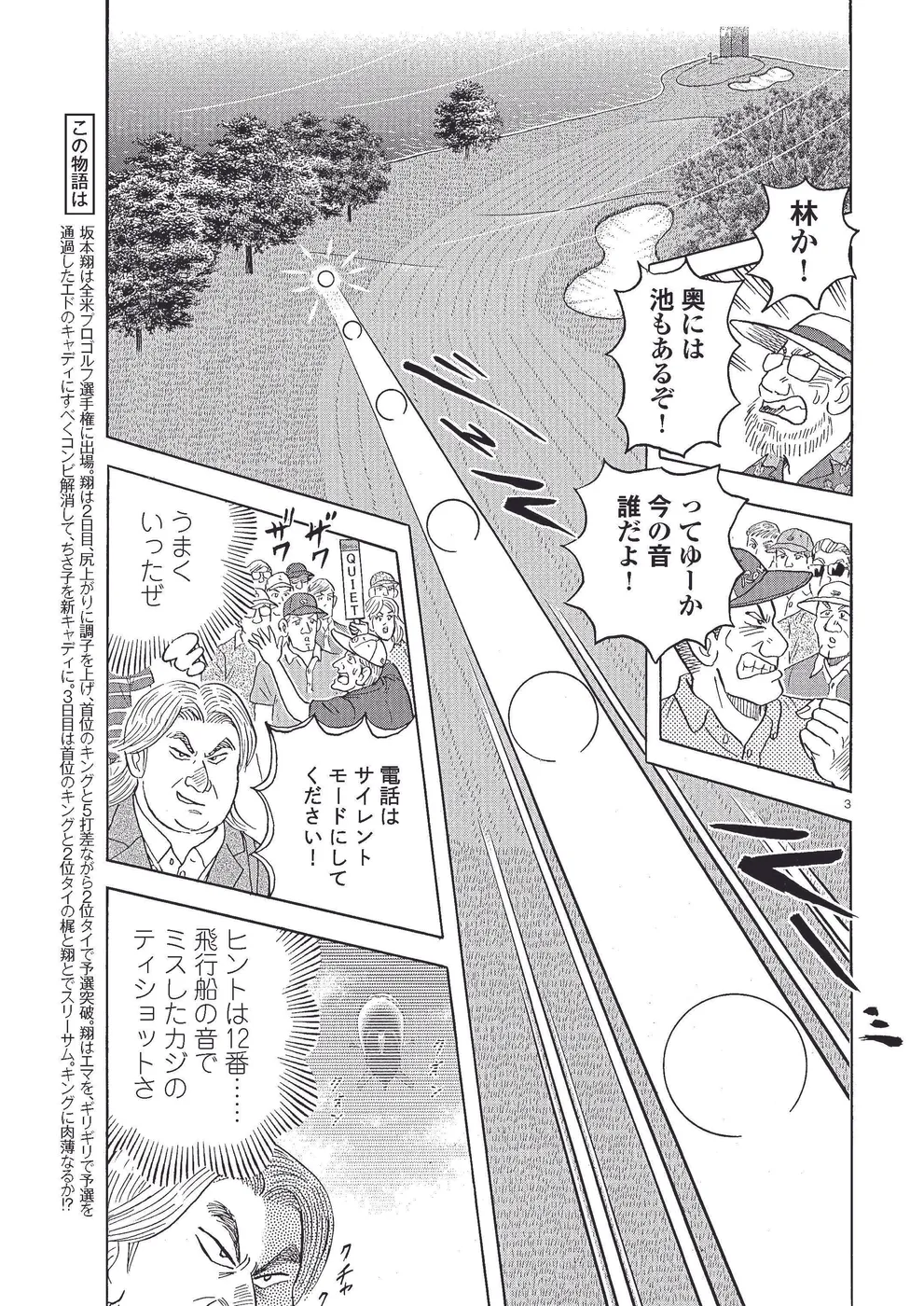 坂本翔は全米プロゴルフ選手権に出場。翔は2日目、尻上がりに調子を上げ、首位のキングと5打差ながら2位タイで予選突破。翔はエマを、ギリギリで予選を通過したエドのキャディにすべくコンビ解消して、ちさ子を新キャディに。3日目は首位のキングと2位タイの梶と翔とでスリーサム。キングに肉薄なるか!?