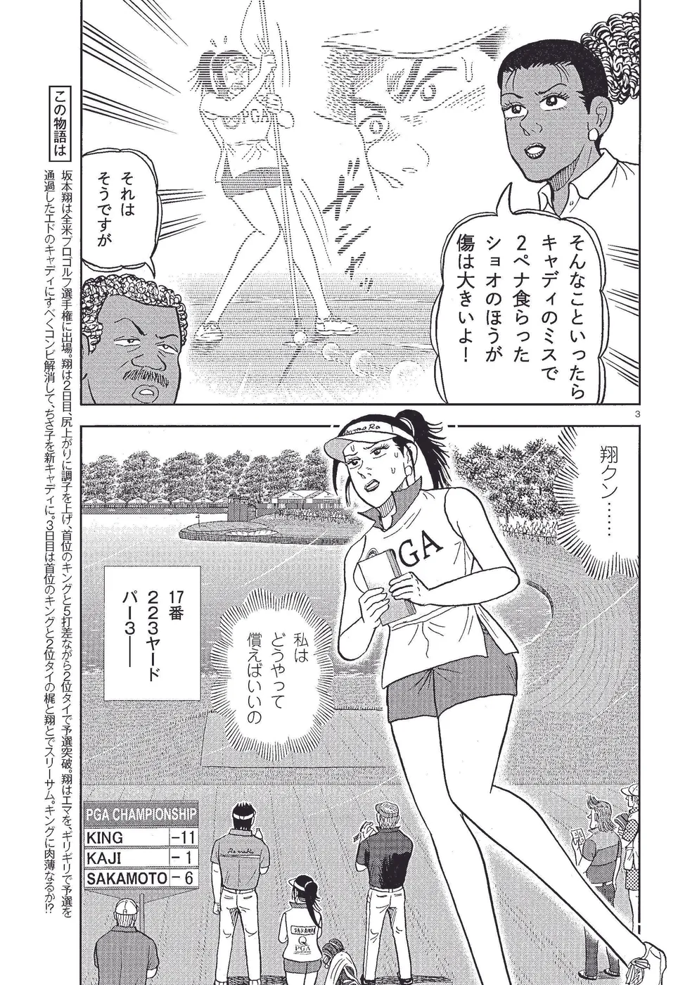 坂本翔は全米プロゴルフ選手権に出場。翔は2日目、尻上がりに調子を上げ、首位のキングと5打差ながら2位タイで予選突破。翔はエマを、ギリギリで予選を通過したエドのキャディにすべくコンビ解消して、ちさ子を新キャディに。3日目は首位のキングと2位タイの梶と翔とでスリーサム。キングに肉薄なるか!?