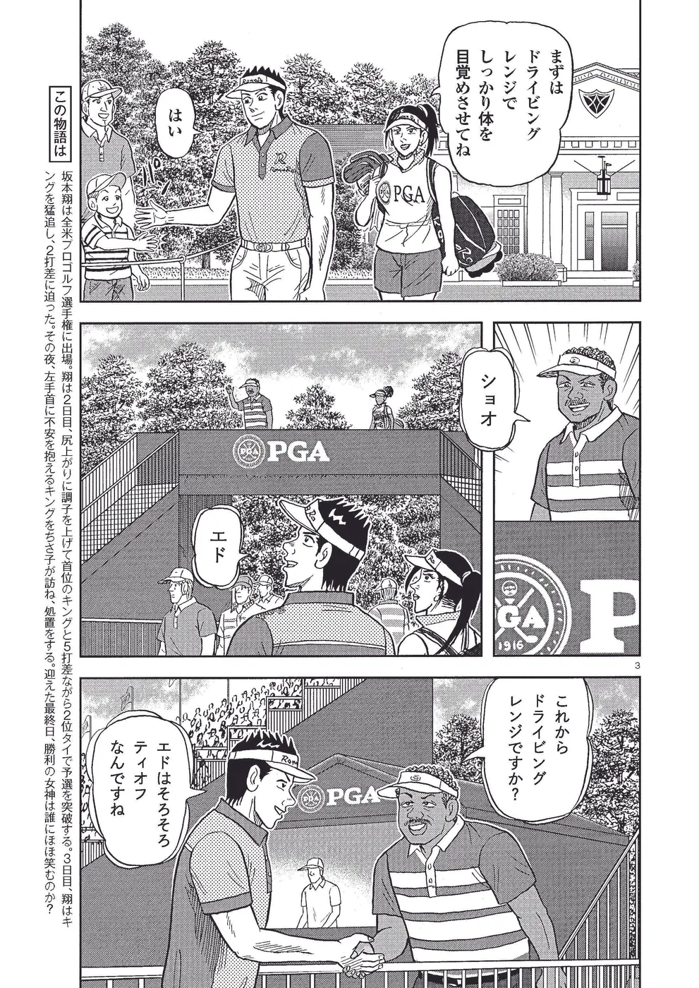 坂本翔は全米プロゴルフ選手権に出場。翔は2日目、尻上がりに調子を上げて首位のキングと5打差ながら2位タイで予選を突破する。3日目、翔はキングを猛追し、2打差に迫った。その夜、左手首に不安を抱えるキングをちさ子が訪ね、処置をする。迎えた最終日、勝利の女神は誰にほほ笑むのか?