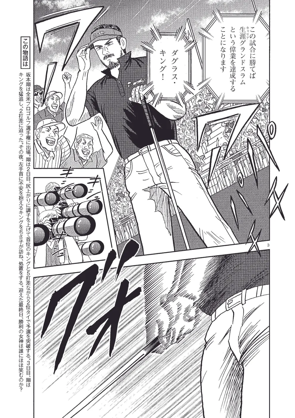 坂本翔は全米プロゴルフ選手権に出場。翔は2日目、尻上がりに調子を上げて首位のキングと5打差ながら2位タイで予選を突破する。3日目、翔はキングを猛追し、2打差に迫った。その夜、左手首に不安を抱えるキングをちさ子が訪ね、処置をする。迎えた最終日、勝利の女神は誰にほほ笑むのか?