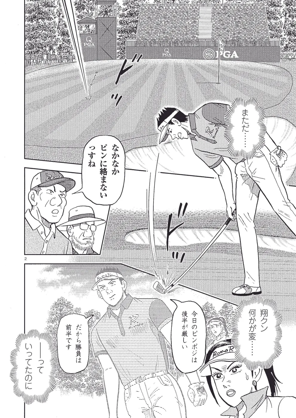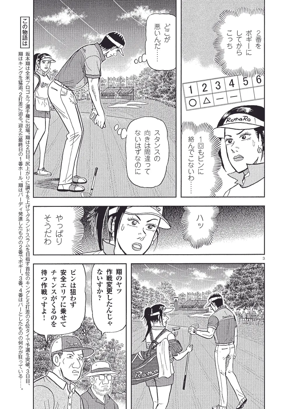 坂本翔は全米プロゴルフ選手権に出場。翔は2日目、尻上がりに調子を上げてグランドスラムを目指す首位のキングと5打差の2位タイで予選を突破。3日目、翔はキングを猛追、2打差に迫る。迎えた最終日の1番ホール、翔はバーディ発進したものの2番でボギー。3番、4番はパーとしたものの何かが狂っている……