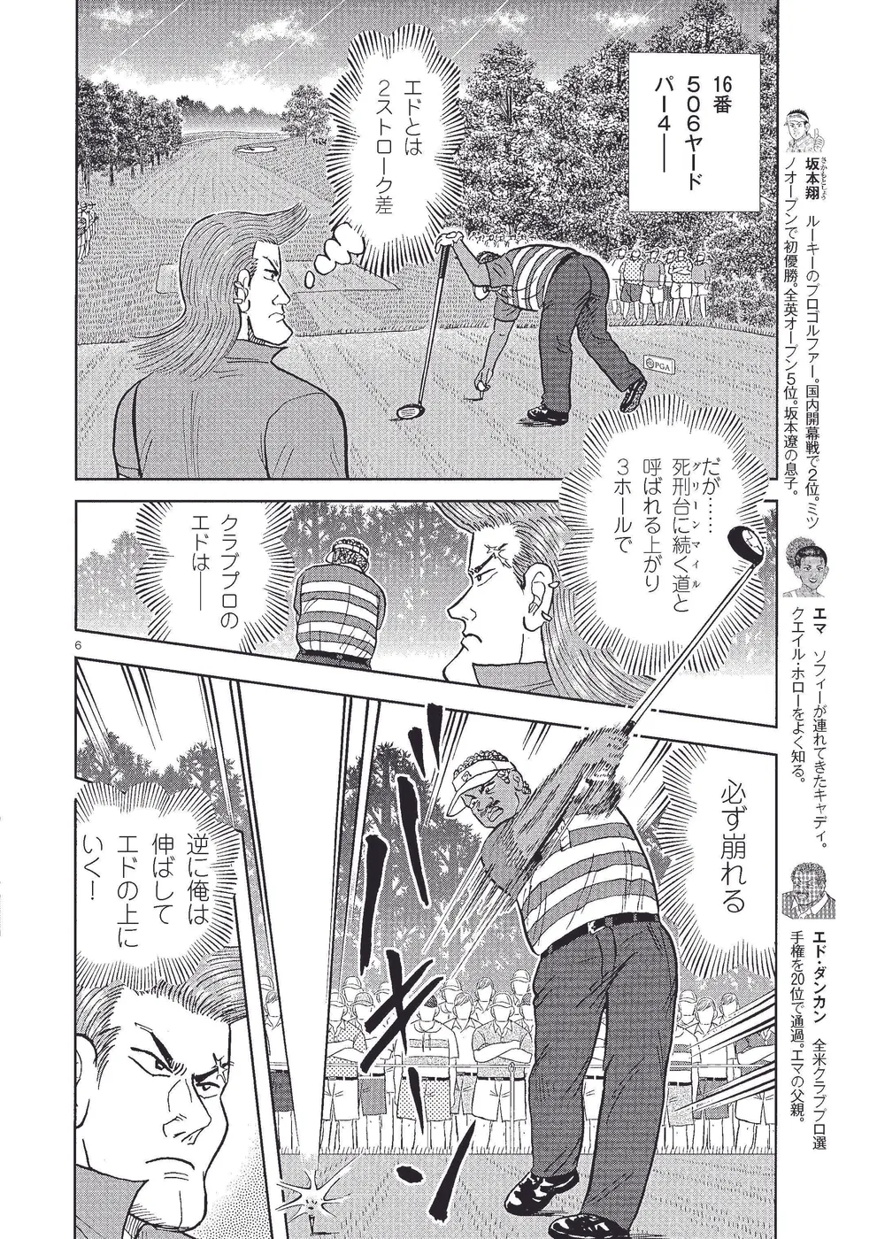 坂本翔は全米プロゴルフ選手権に出場。翔はグランドスラムを目指す首位のキングを追い、2打差で最終日を迎える。序盤で翔は空回りするも7番、8番の連続バーディでキングに1打差と詰め寄る。一方、少しでも上の順位を目指すエドは 15番、ギャンブルに成功してパーオンを狙える位置にボールを運ぶが……