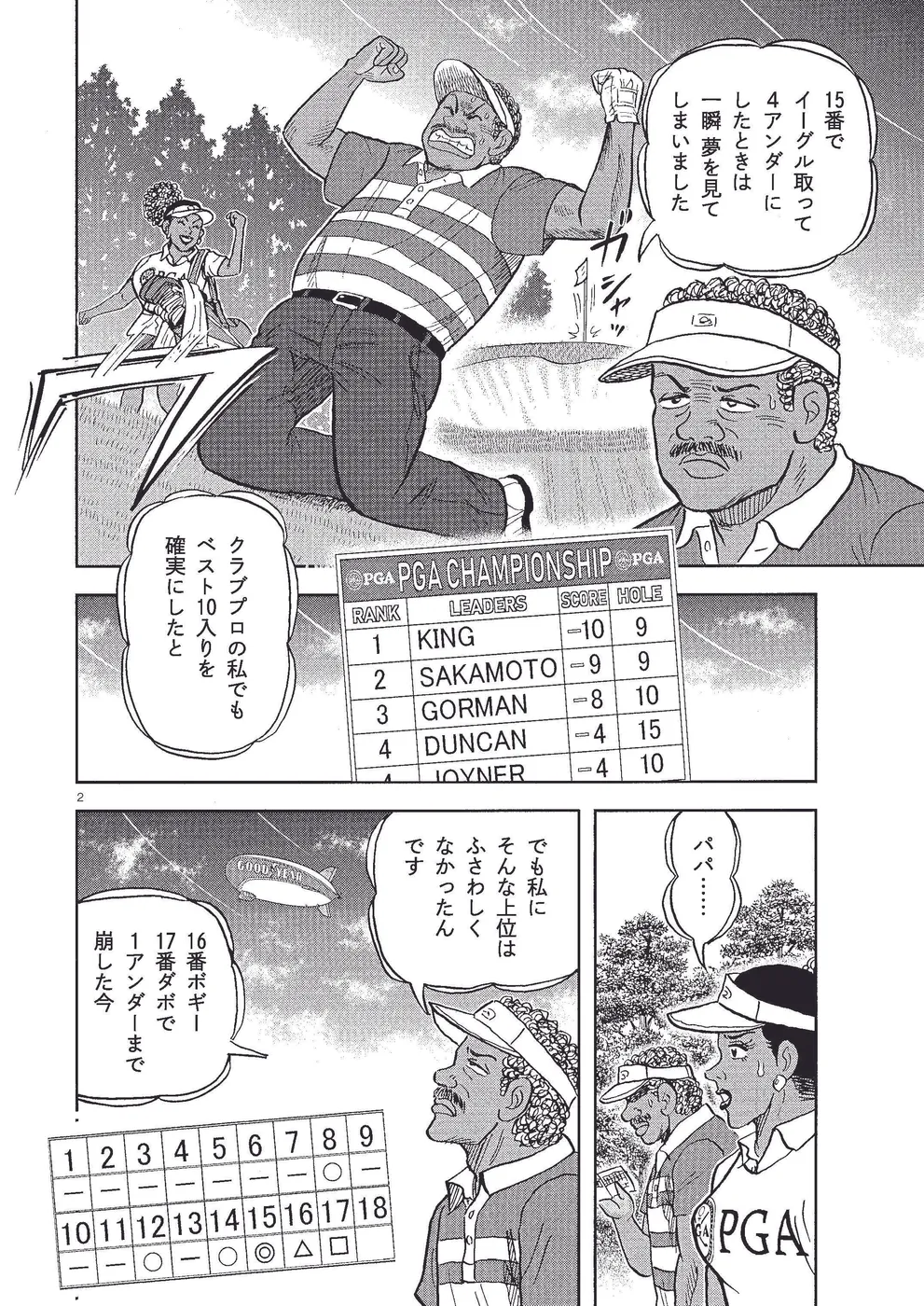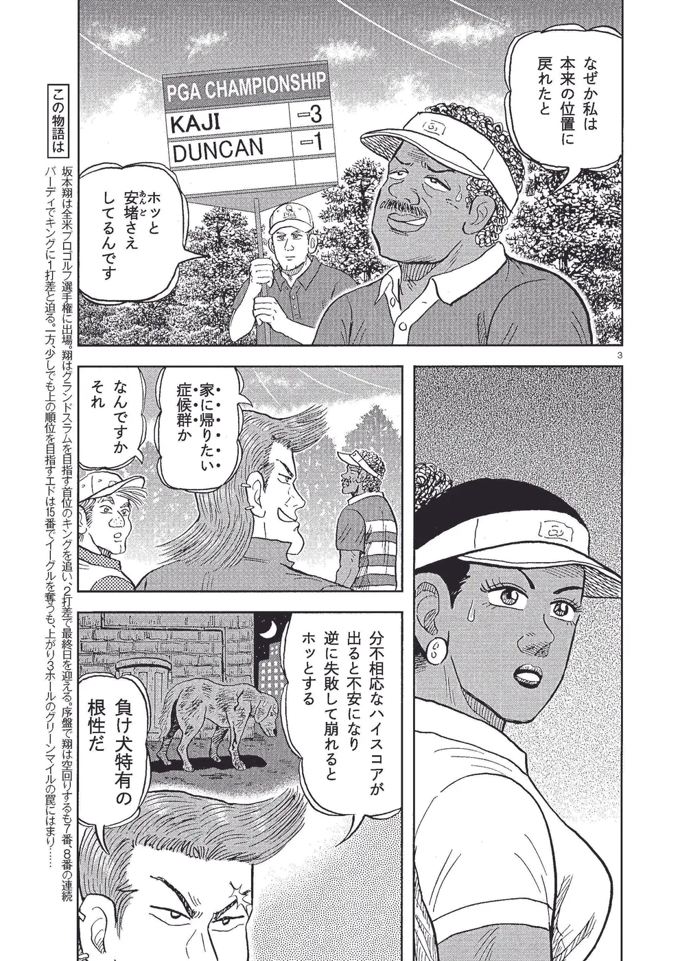 坂本翔は全米プロゴルフ選手権に出場。翔はグランドスラムを目指す首位のキングを追い、2打差で最終日を迎える。序盤で翔は空回りするも7番、8番の連続バーディでキングに1打差と迫る。一方、少しでも上の順位を目指すエドは15番でイーグルを奪うも、上がり3ホールのグリーンマイルの罠にはまり……