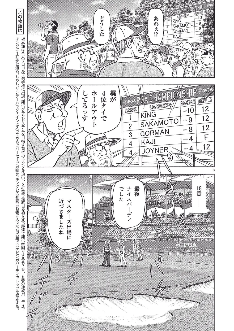 坂本翔は全米プロゴルフ選手権に出場。翔はグランドスラムを目指す首位のキングを追い、2打差で最終日を迎える。序盤で翔は空回りするも7番、8番の連続バーディで キングに1打差と迫る。しかし、サンデーバックナインに入ってからはパーセーブが続き、キングとの死闘は12番に入った。前の組ではケビンがバーディでトップを追走する。