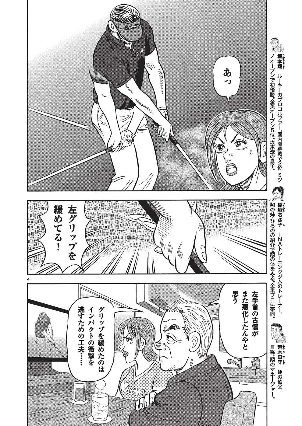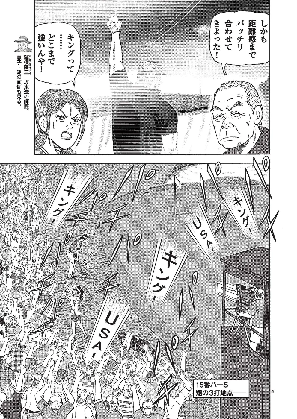 坂本翔は全米プロゴルフ選手権に出場。翔はグランドスラムを目指す首位のキングを追い、2打差で最終日を迎えた。バックナインに入り、優勝争いはキングと翔、前の組で回る全英オープン優勝のケビン・ゴーマンに絞られる。15番パー5、左手首の痛みが再発したキングは2オンを逃し、バンカーショットに臨むが……