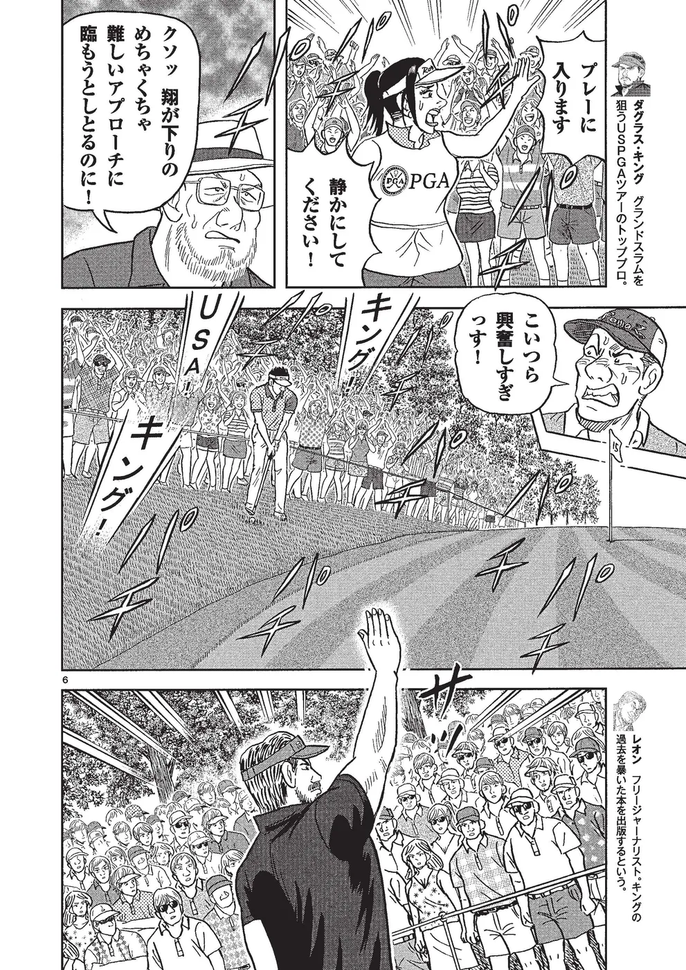 坂本翔は全米プロゴルフ選手権に出場。翔はグランドスラムを目指す首位のキングを追い、2打差で最終日を迎えた。バックナインに入り、優勝争いはキングと翔、前の組で回る全英オープン優勝のケビン・ゴーマンに絞られる。15番パー5、左手首の痛みが再発したキングは2オンを逃し、バンカーショットに臨むが……