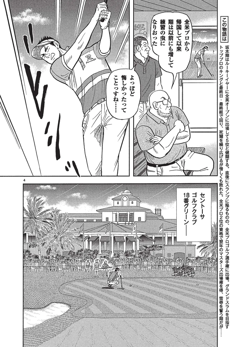 坂本翔はルーキーイヤーに全英オープンに出場して5位と健闘する。直後にスランプに陥るものの、全米プロゴルフ選手権に出場。グランドスラムを目指すトッププロのキングと最終日・最終組で周り、死闘を繰り広げるが惜しくも敗れた。全米プロ2位の資格で翌年のマスターズ出場権を得て、雪辱を誓う翔だが……