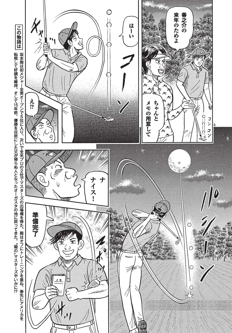坂本翔は初メジャー全英オープンで5位に入り、ついで全米プロで2位に入ったことで翌年のマスターズ出場権を得た。翔はオフにトレーニングを重ね、春先にアメリカを転戦して好調を維持。そして15年前、優勝を目前にした父が帰らぬ人となったオーガスタの地に戻ってきた。いよいよ翔のマスターズやいかに!?