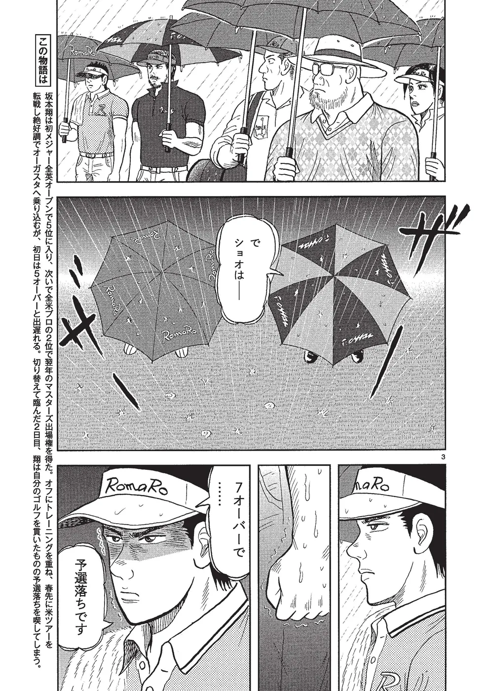 坂本翔は初メジャー全英オープンで5位に入り、ついで全米プロで2位に入ったことで翌年のマスターズ出場権を得た。オフにトレーニングを重ね、春先にアメリカを転戦して好調を維持、オーガスタへ乗り込んだ。初日に5オーバーと出遅れた翔は2日目、自分のゴルフを貫くものの、予選落ちを喫してしまう。