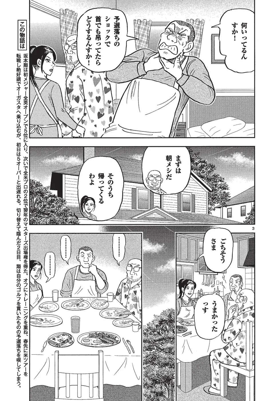 坂本翔は初メジャー全英オープンで5位に入り、ついで全米プロで2位に入ったことで翌年のマスターズ出場権を得た。オフにトレーニングを重ね、春先にアメリカを転戦して好調を維持、オーガスタへ乗り込んだ。初日に5オーバーと出遅れた翔は2日目、自分のゴルフを貫くものの、予選落ちを喫してしまう。