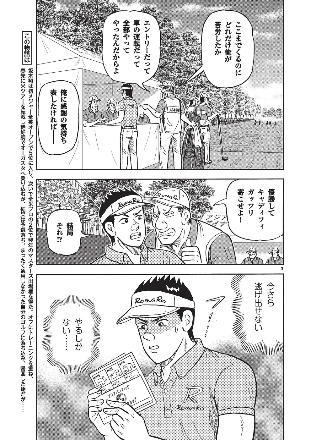 坂本翔は初メジャー全英オープンで5位に入り、ついで全米プロで2位に入ったことで翌年のマスターズ出場権を得た。オフにトレーニングを重ね、春先にアメリカを転戦して好調を維持、オーガスタへ乗り込んだが、結果は予選落ち。まったく通用しなかった自分のゴルフに落ち込み、帰国した翔だが……