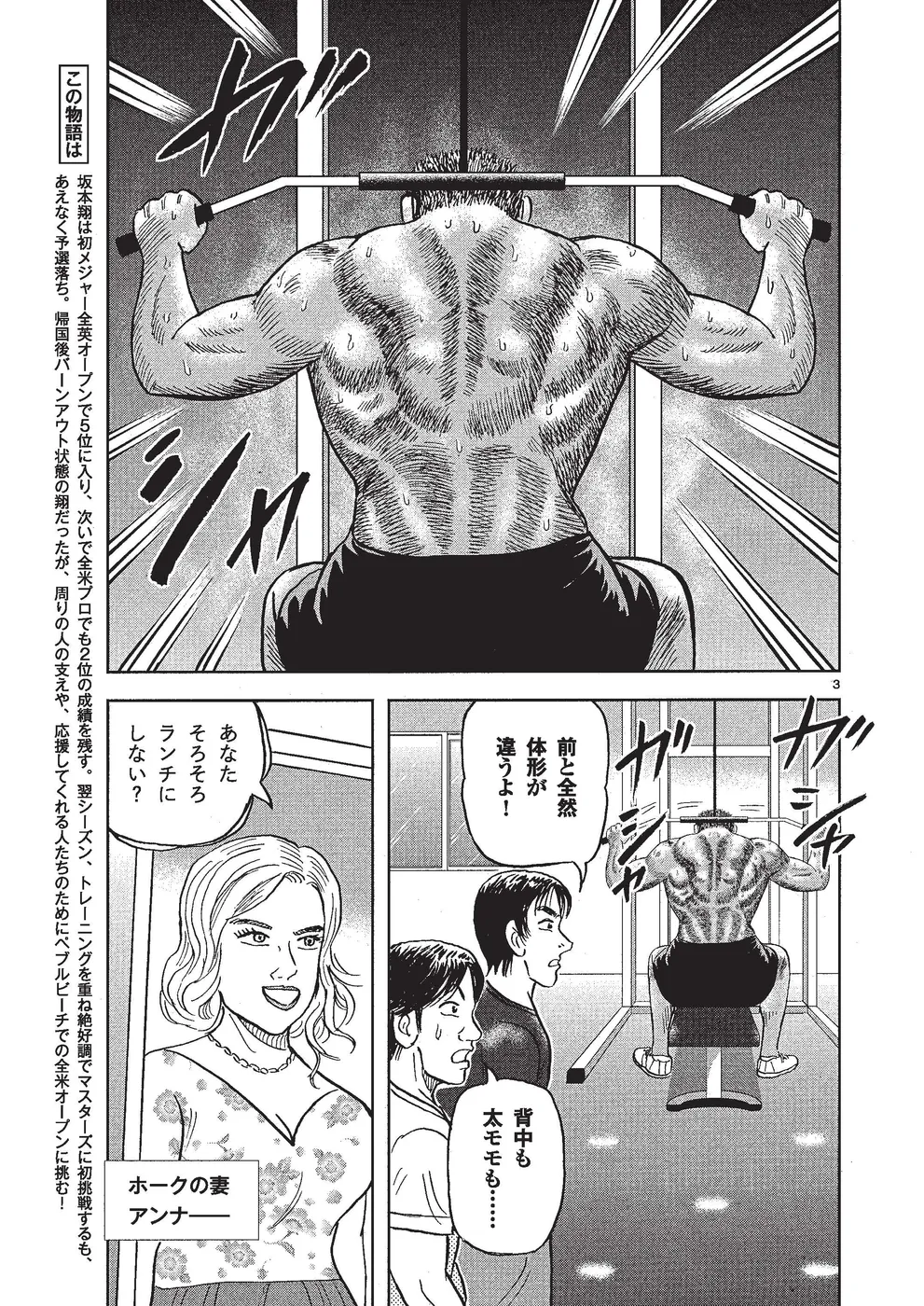 坂本翔は初メジャー全英オープンで5位に入り、ついで全米プロで2位に入ったことで翌年のマスターズ出場権を得た。オフにトレーニングを重ね、春先にアメリカを転戦して好調を維持、オーガスタへ乗り込んだが、結果は予選落ち。帰国後バーンアウト状態の翔だったが、周りの人の支えや、応援してくれる人たちのために全米オープンに挑む決意をする!