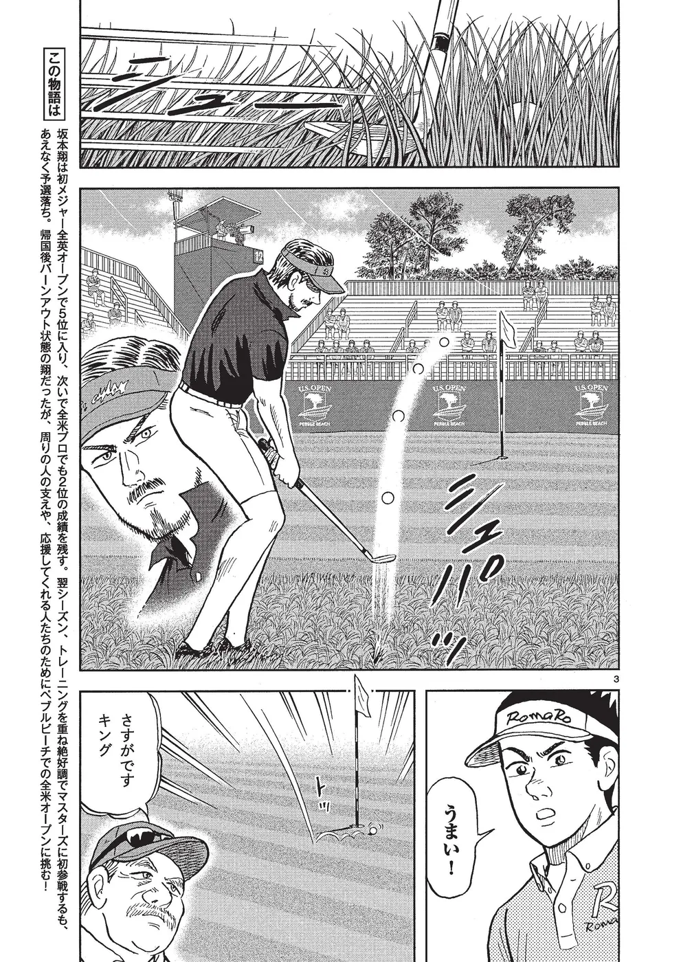 坂本翔は初メジャー全英オープンで5位に入り、ついで全米プロで2位に入ったことで翌年のマスターズ出場権を得た。オフにトレーニングを重ね、春先にアメリカを転戦して好調を維持、オーガスタへ乗り込んだが、結果は予選落ち。帰国後バーンアウト状態の翔だったが、周りの人の支えや、応援してくれる人たちのためにペブルビーチでの全米オープンに挑む!