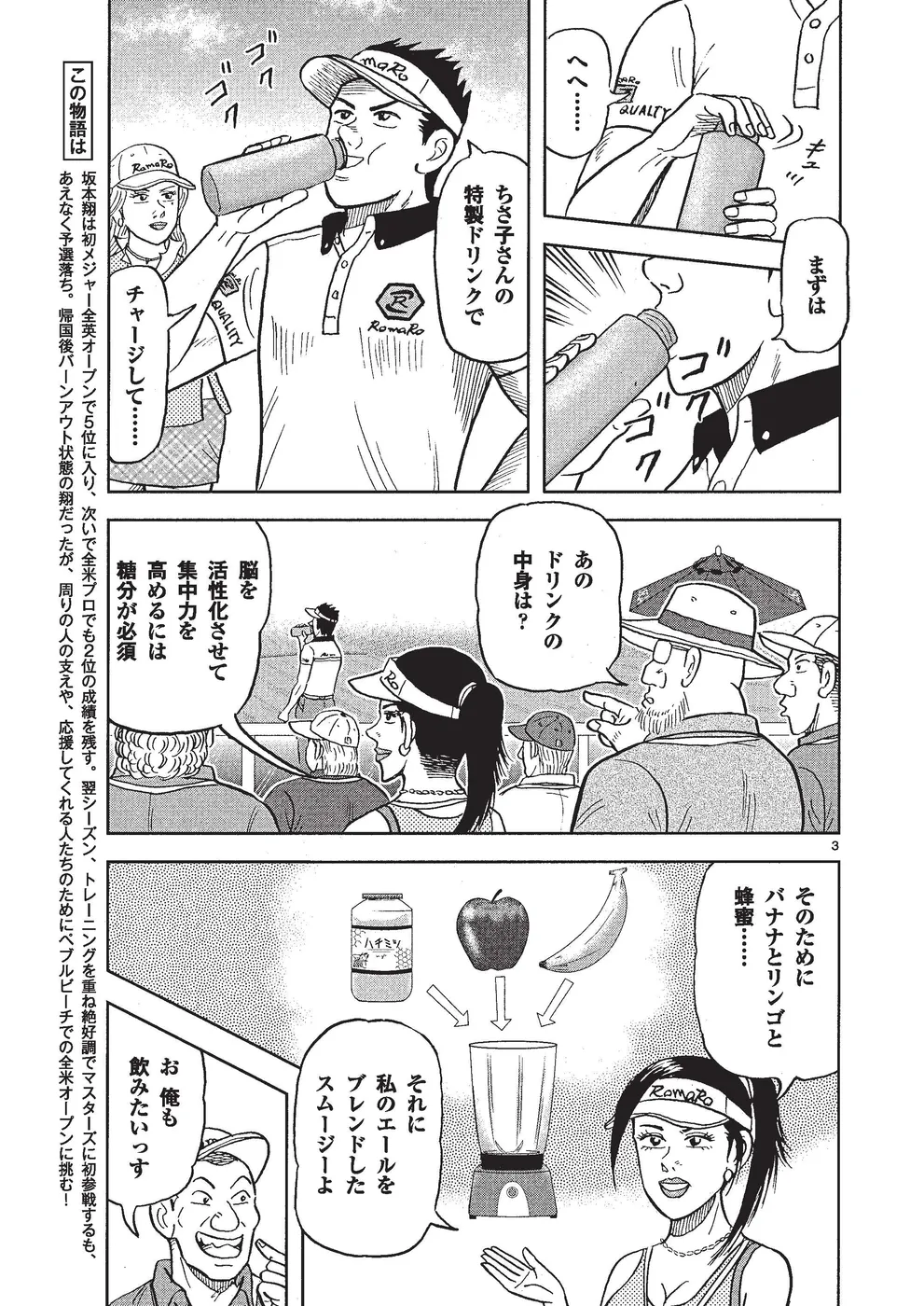 坂本翔は初メジャー全英オープンで5位に入り、ついで全米プロで2位に入ったことで翌年のマスターズ出場権を得た。オフにトレーニングを重ね、春先にアメリカを転戦して好調を維持、オーガスタへ乗り込んだが、結果は予選落ち。帰国後バーンアウト状態の翔だったが、周りの人の支えや、応援してくれる人たちのためにペブルビーチでの全米オープンに挑む!