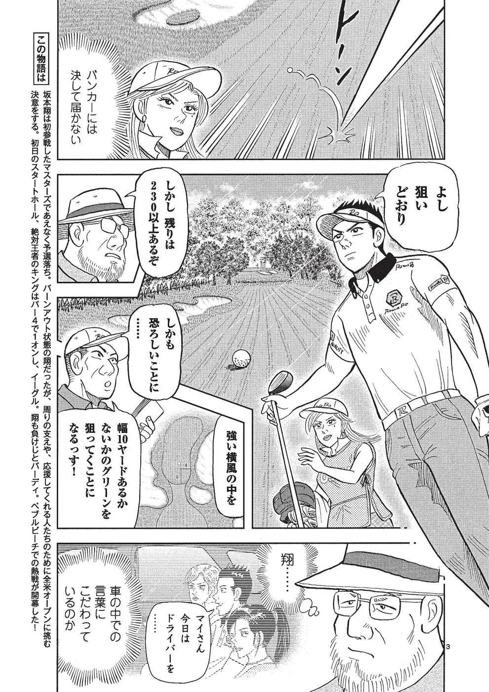 坂本翔は初参戦したマスターズであえなく予選落ち。バーンアウト状態の翔だったが、周りの支えや、応援してくれる人たちのためにペブルビーチでの全米オープンに挑む決意をする。初日のスタートホール、絶対王者のキングはパー4で1オンし、イーグル。翔も負けじとバーディ。べプルビーチでの熱戦が開幕した!