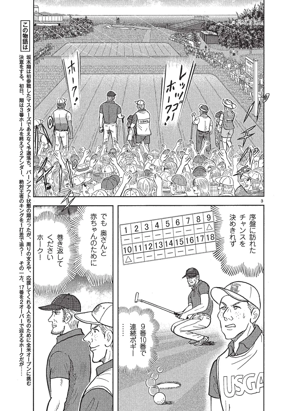 坂本翔は初参戦したマスターズであえなく予選落ち。バーンアウト状態の翔だったが、周りの支えや、応援してくれる人たちのためにペブルビーチでの全米オープンに挑む決意をする。初日、翔は3番ホールを終えて2アンダー、絶対王者のキングを1打差で追う。その一方、17番を2オーバーで迎えるホークだが……