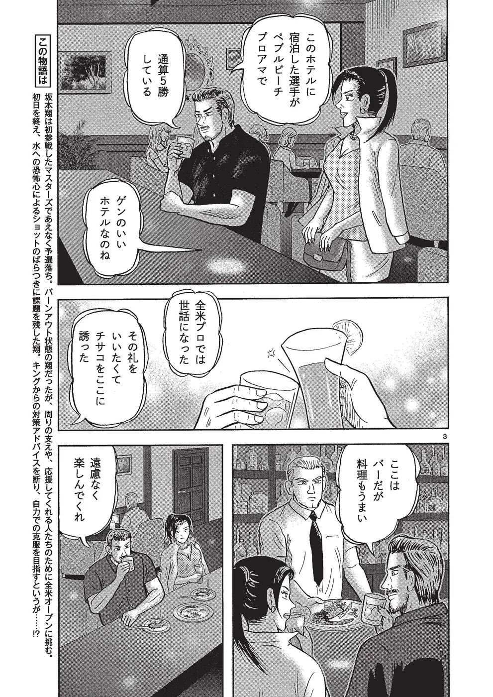 坂本翔は初参戦したマスターズであえなく予選落ち。バーンアウト状態の翔だったが、周りの支えや、応援してくれる人たちのためにペブルビーチでの全米オープンに挑む。初日を終え、水への恐怖心によるショットのばらつきに課題を残した翔。キングからの対策アドバイスを断り、自力での克服を目指すというが……!?