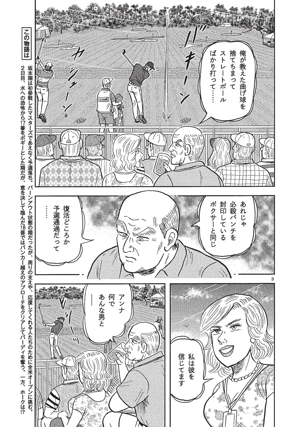 坂本翔は初参戦したマスターズであえなく予選落ち。バーンアウト状態の翔だったが、周りの支えや、応援してくれる人たちのためにペブルビーチでの全米オープンに挑む。2日目、水への恐怖から17番をボギーとした翔だが、意を決して臨んだ18番ではバンカー越えのアプローチをクリアしてバーディを奪う。一方、ホークは!?