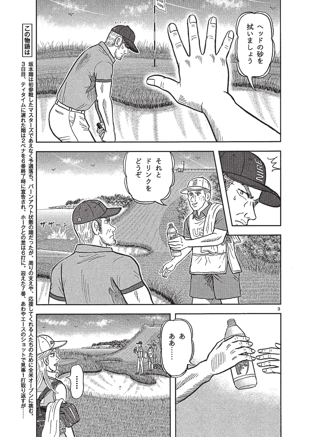 坂本翔は初参戦したマスターズであえなく予選落ち。バーンアウト状態の翔だったが、周りの支えや、応援してくれる人たちのためにペブルビーチでの全米オープンに挑む。3日目、ティタイムに遅れた翔は2ペナを6番ホール終了時に宣告され、ホークとの差は6打に。迎えた7番、あわやエースのショットで見事1打取り返すが……