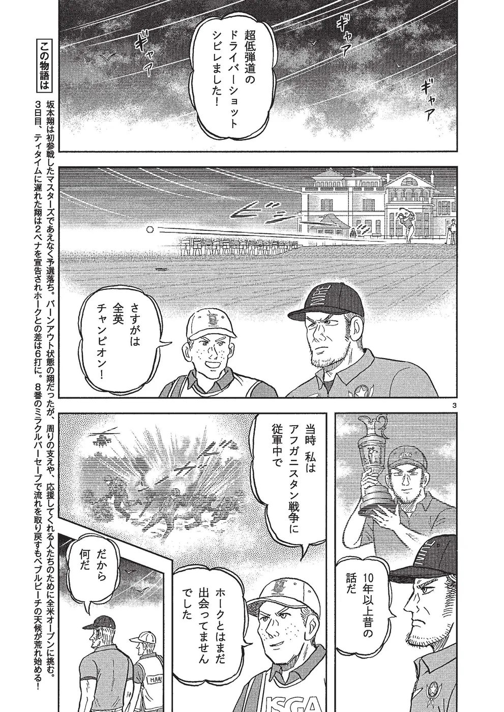 坂本翔は初参戦したマスターズであえなく予選落ち。バーンアウト状態の翔だったが、周りの支えや、応援してくれる人たちのためにペブルビーチでの全米オープンに挑む。3日目、ティタイムに遅れた翔は2ペナを宣告されホークとの差は6打に。8番のミラクルパーセーブで流れを取り戻すもペブルビーチの天候が荒れ始める!