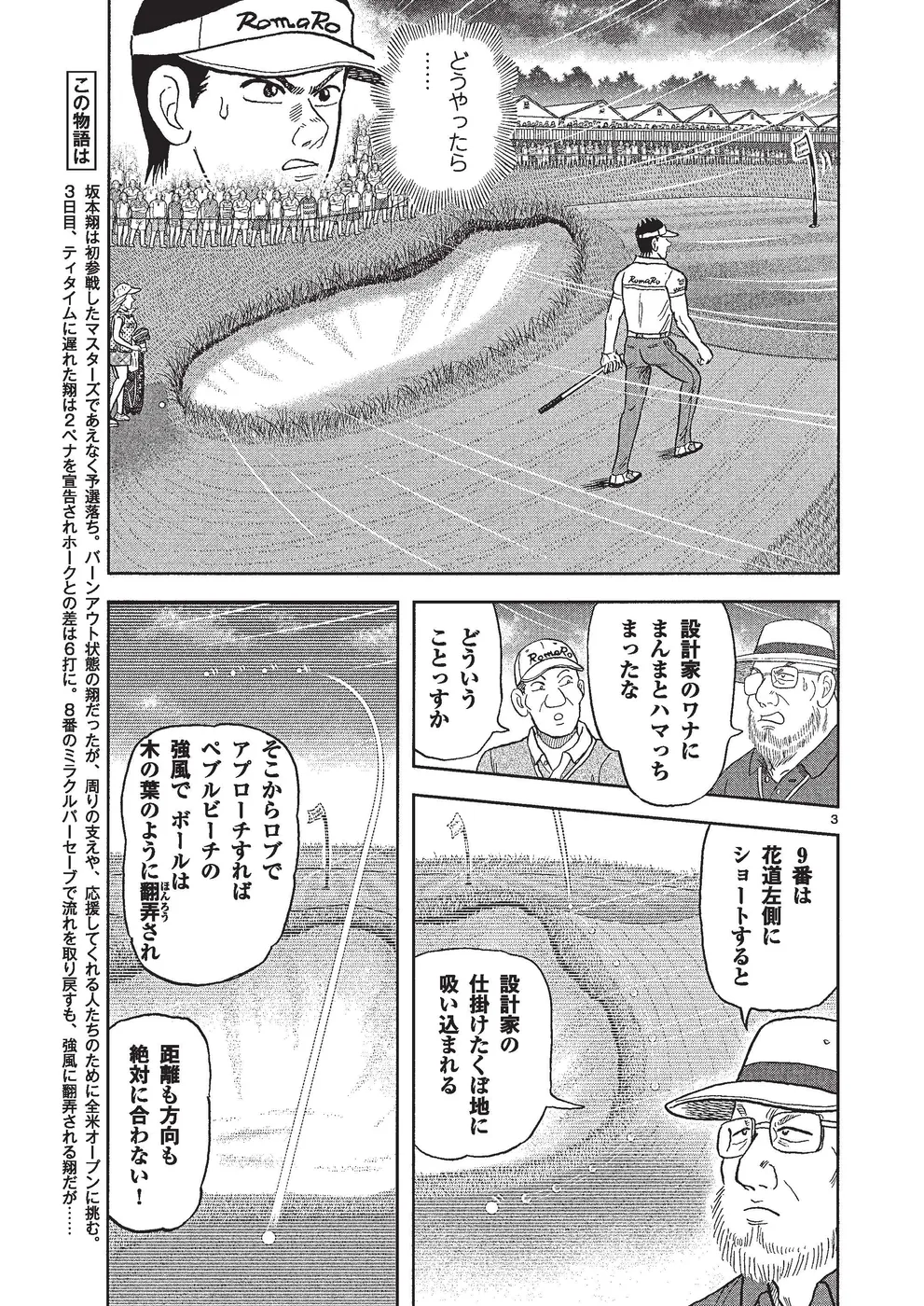 坂本翔は初参戦したマスターズであえなく予選落ち。バーンアウト状態の翔だったが、周りの支えや、応援してくれる人たちのためにペブルビーチでの全米オープンに挑む。3日目、ティタイムに遅れた翔は2ペナを宣告されホークとの差は6打に。8番のミラクルパーセーブで流れを取り戻すも、強風に翻弄される翔だが……