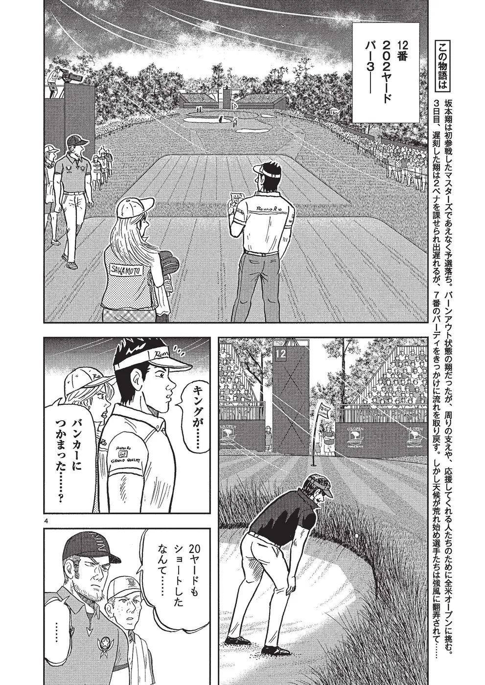 坂本翔は初参戦したマスターズであえなく予選落ち。バーンアウト状態の翔だったが、周りの支えや、応援してくれる人たちのためにペブルビーチでの全米オープンに挑む。3日目、ティタイムに遅れた翔は2ペナを宣告されホークとの差は6打に。8番のミラクルパーセーブで流れを取り戻すも、強風に翻弄される翔だが……