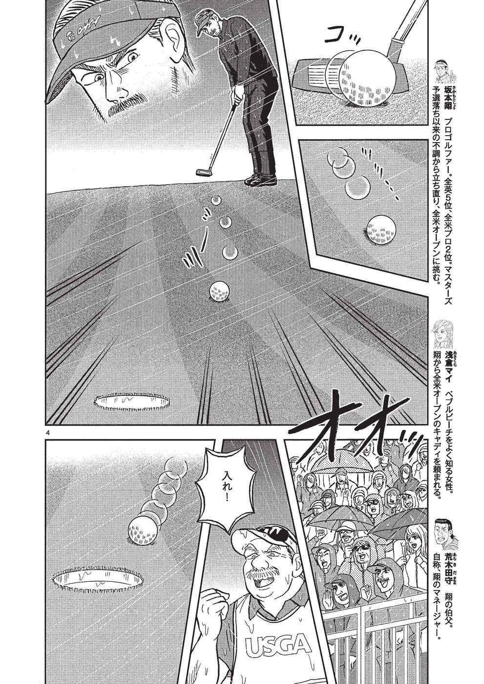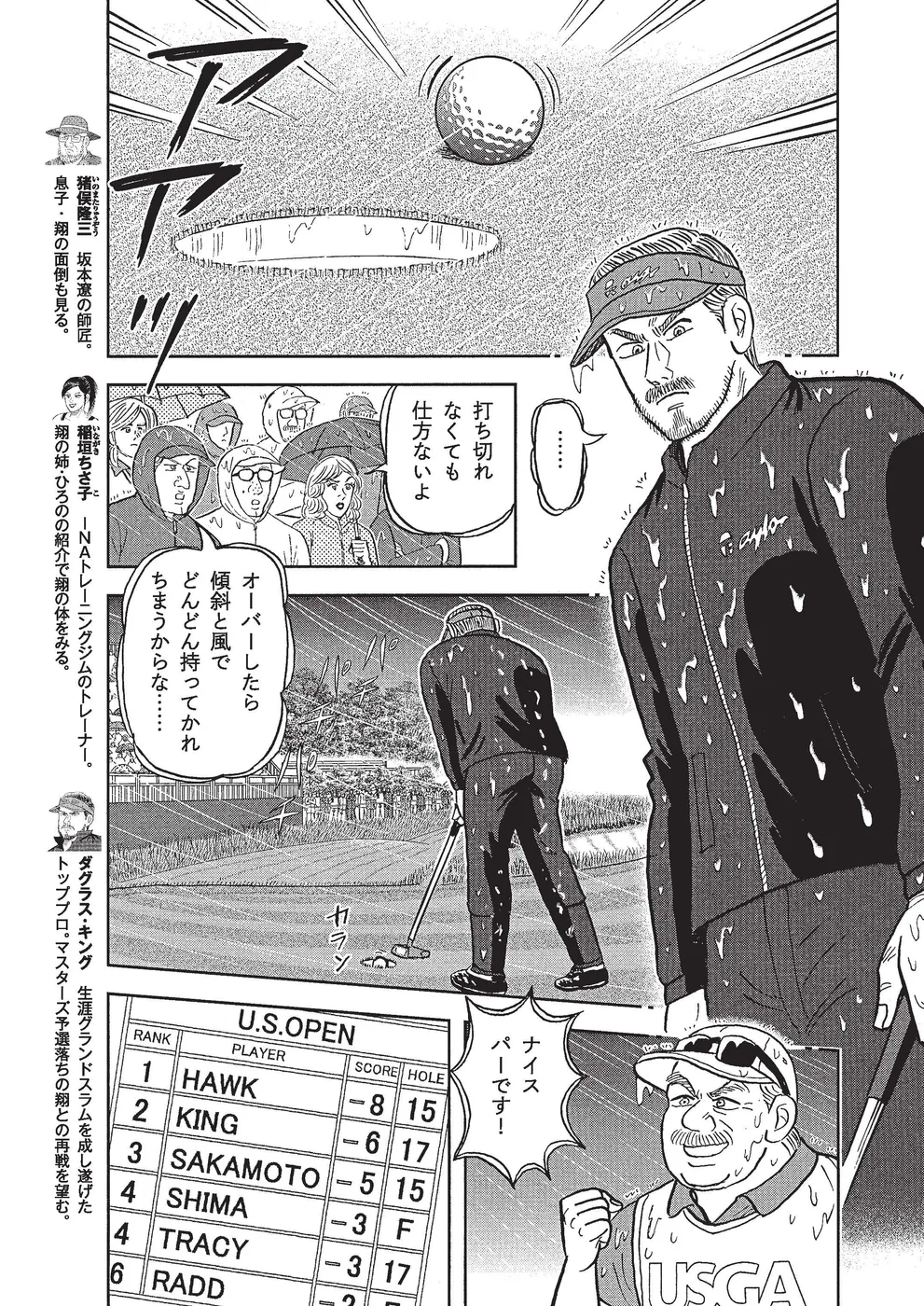 坂本翔は初参戦したマスターズであえなく予選落ち。バーンアウト状態の翔だったが、周りの支えや、応援してくれる人たちのためにペブルビーチでの全米オープンに挑む。3日目、遅刻した翔は2ペナを課せられ出遅れるが、荒れ始めた天候を味方につけ、ホークを猛追。ムービングデーに抜け出すのは翔かホークか…それともキングか!?