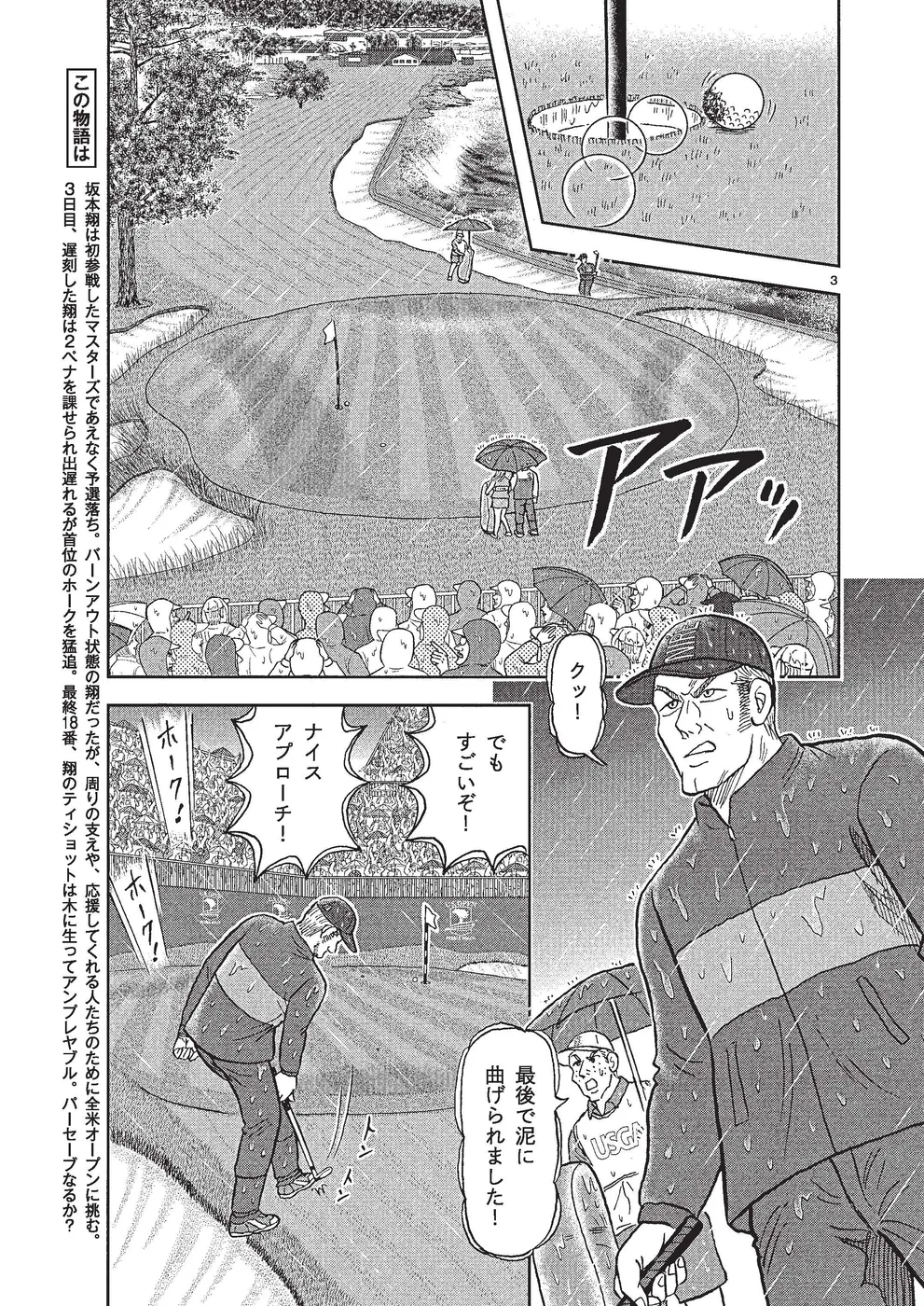 坂本翔は初参戦したマスターズであえなく予選落ち。バーンアウト状態の翔だったが、周りの支えや、応援してくれる人たちのためにペブルビーチでの全米オープンに挑む。3日目、遅刻した翔は2ペナを課せられ出遅れるが、荒れ始めた天候を味方につけ、ホークを猛追。17番を終えて2打差の3位につける。最終18番、翔のティショットは気に生ってアンプレヤブル。パーセーブなるか?