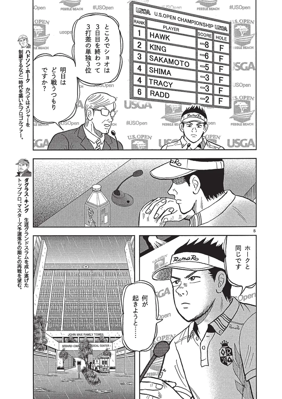 坂本翔は初参戦したマスターズであえなく予選落ち。バーンアウト状態の翔だったが、周りの支えや、応援してくれる人たちのためにペブルビーチでの全米オープンに挑む。3日目、遅刻した翔は2ペナを課せられ出遅れるが、トップのホークとは3打差でホールアウト。スコア提出に向かう2人にホークの父が倒れたとの急報が届き……